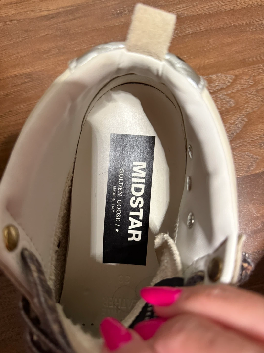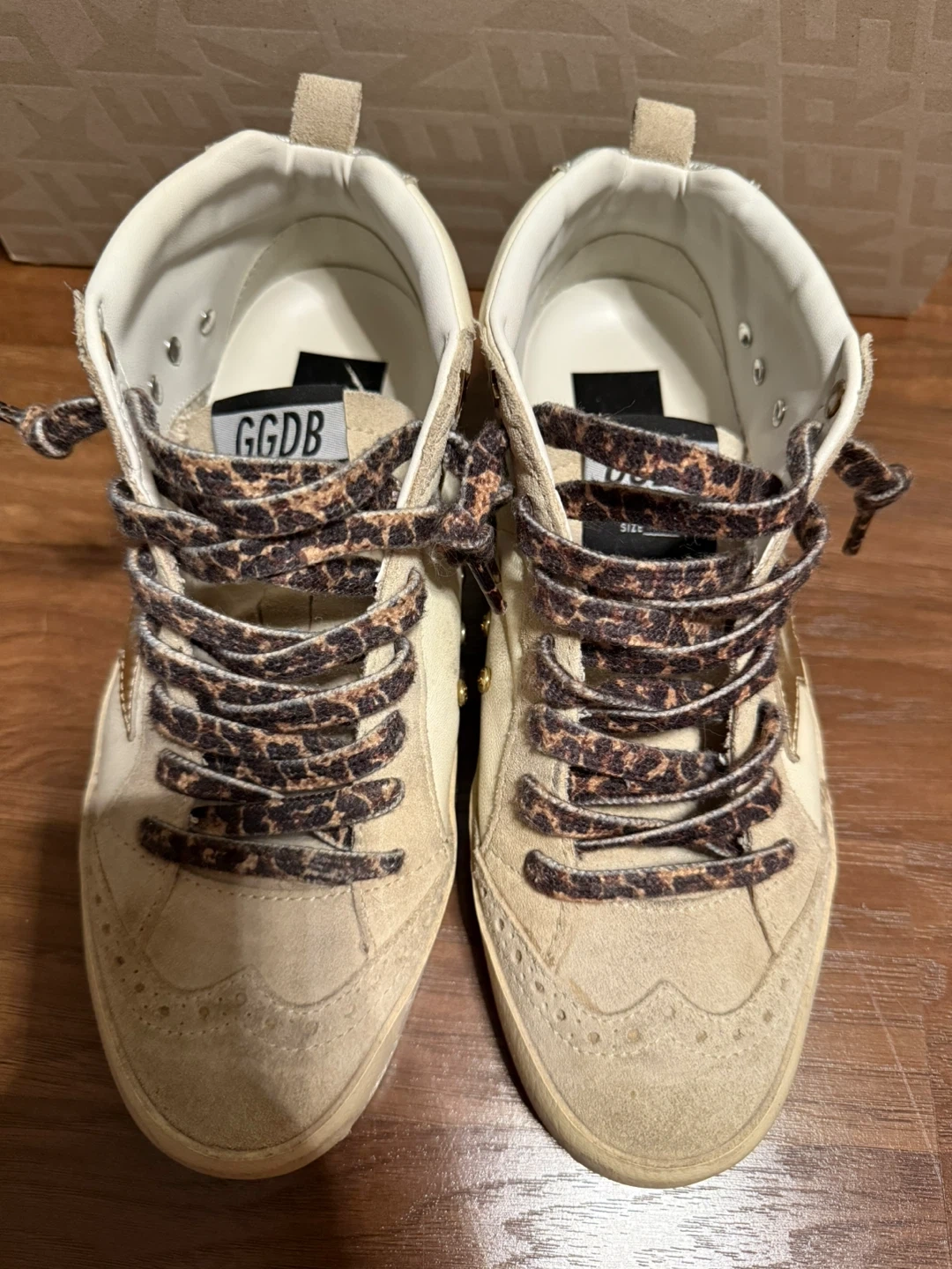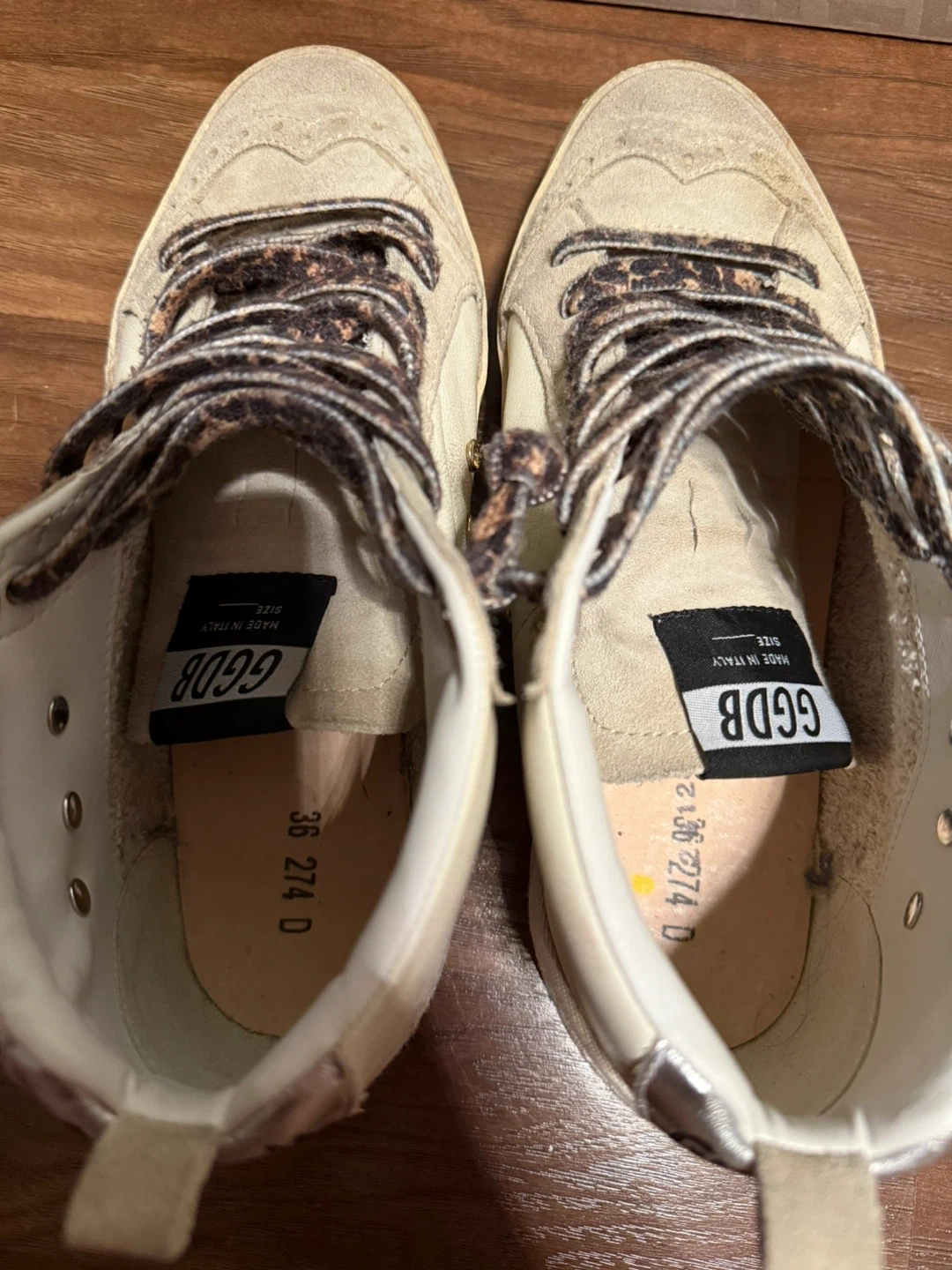 Selling a pair of Golden Goose Mid Star sneakers in size 36. They have a unique design with leopard print laces and rhinestone detailing. These sneakers are super stylish and add a touch of sparkle to any outfit! They show some signs of wear.