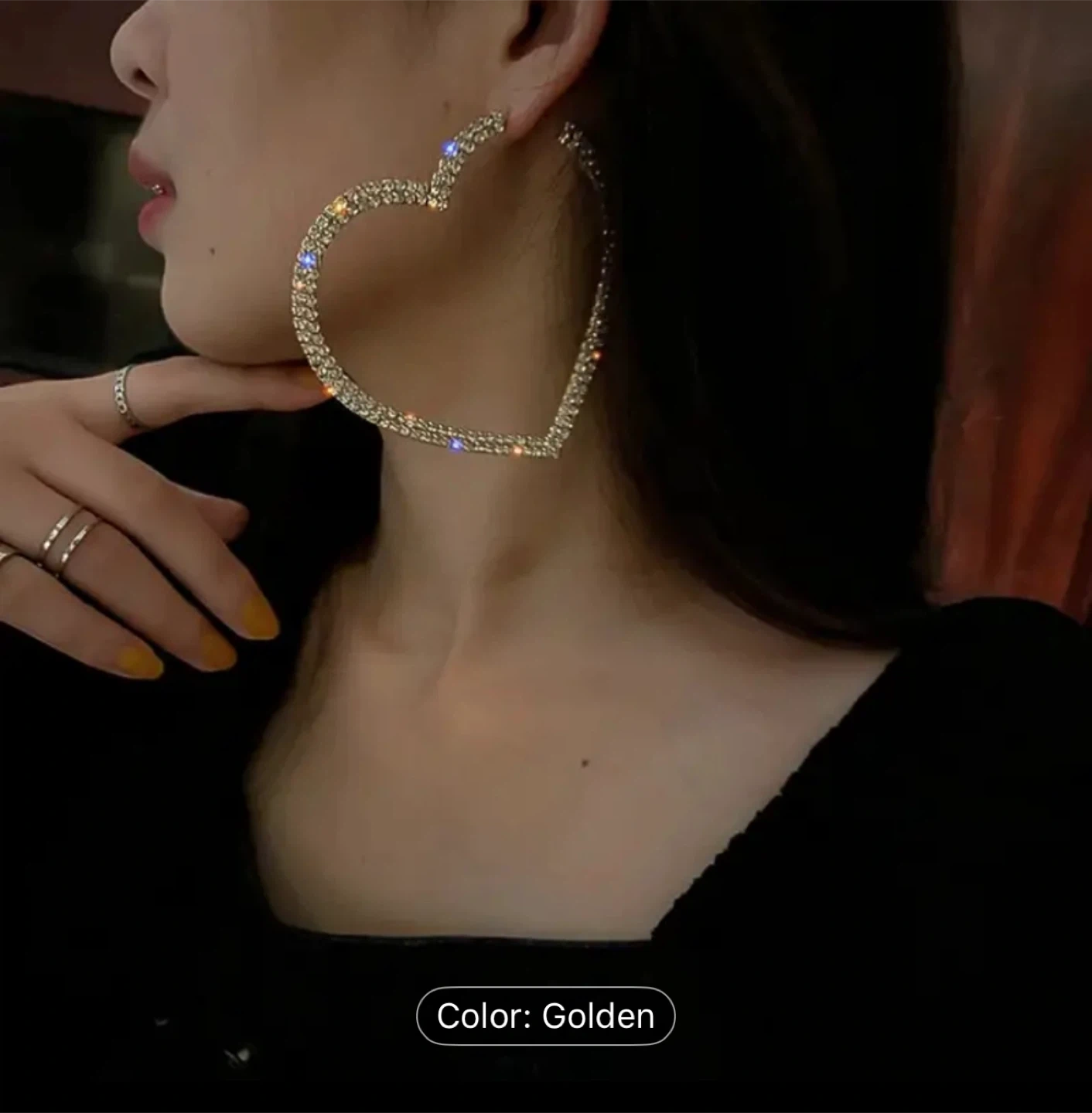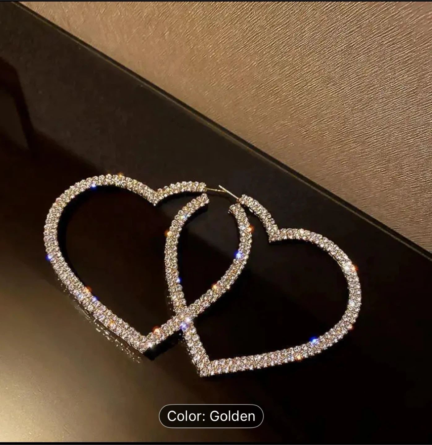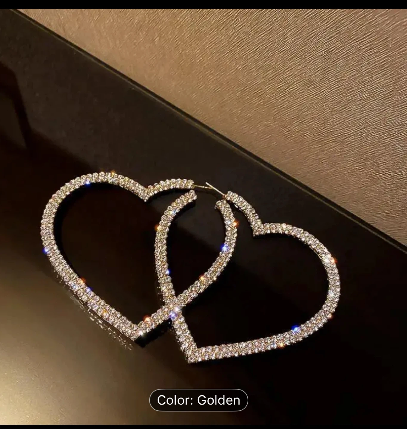 These are a pair of heart-shaped earrings. They are golden in colour and covered in rhinestones. They are in great condition!