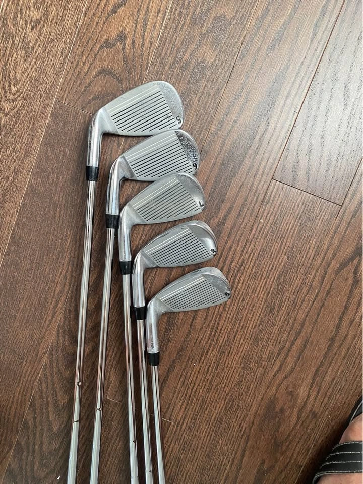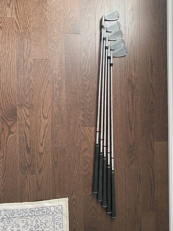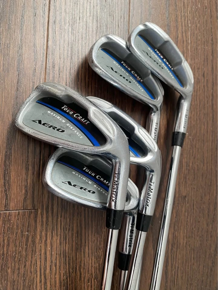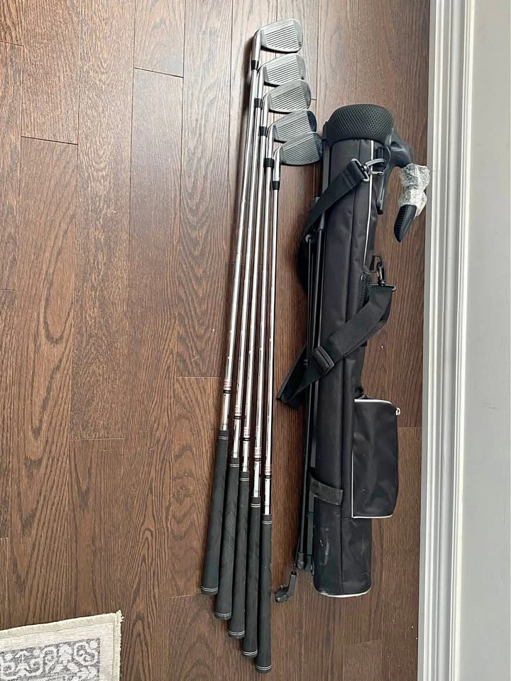 Set of 5 golf clubs with holder. Tour craft brand. Synchronised steel