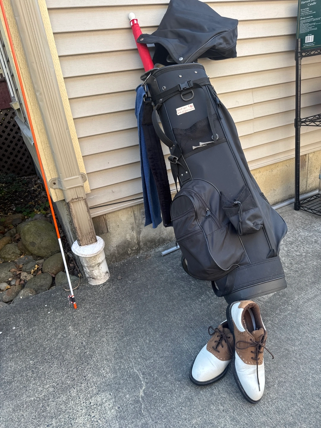 Selling a golf set that includes a black golf bag, cart and a pair of golf shoes. The bag is in excellent condition and comes with a cover. The shoes are white and brown (men’s size 9) Great for anyone looking to get into golf! Includes umbrella, gloves, golf balls, tees, etc.