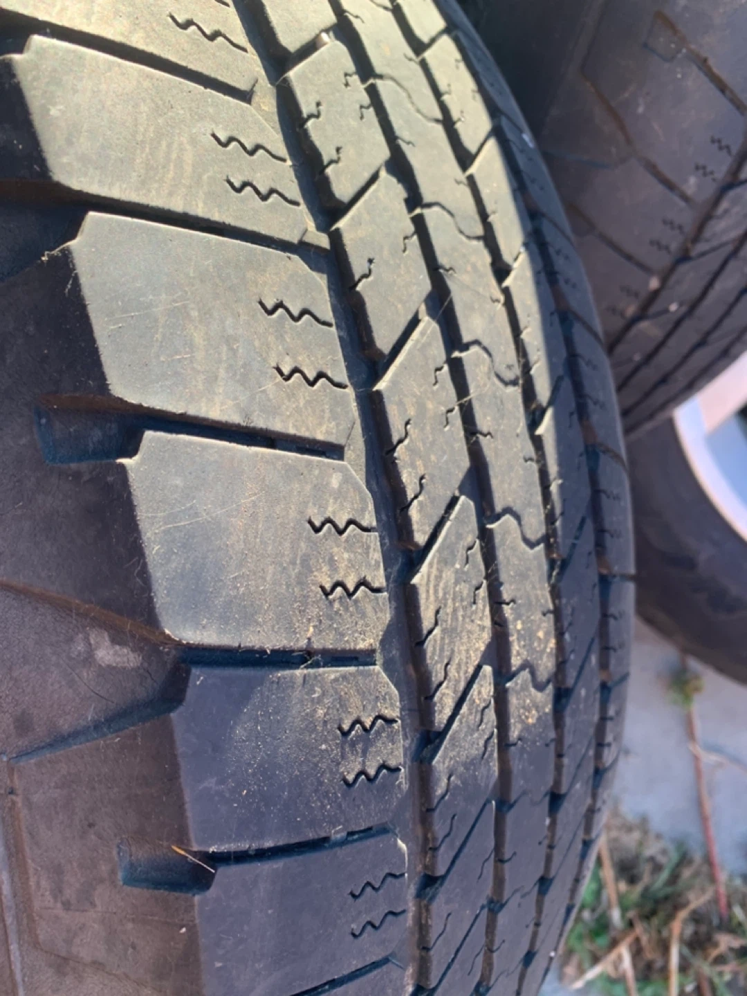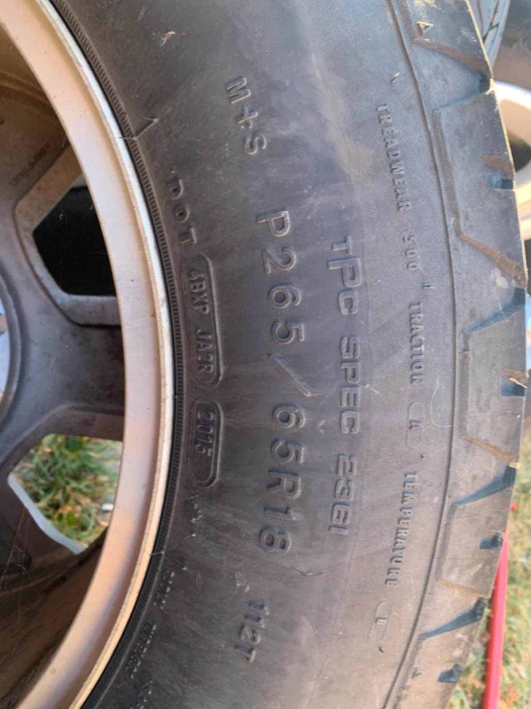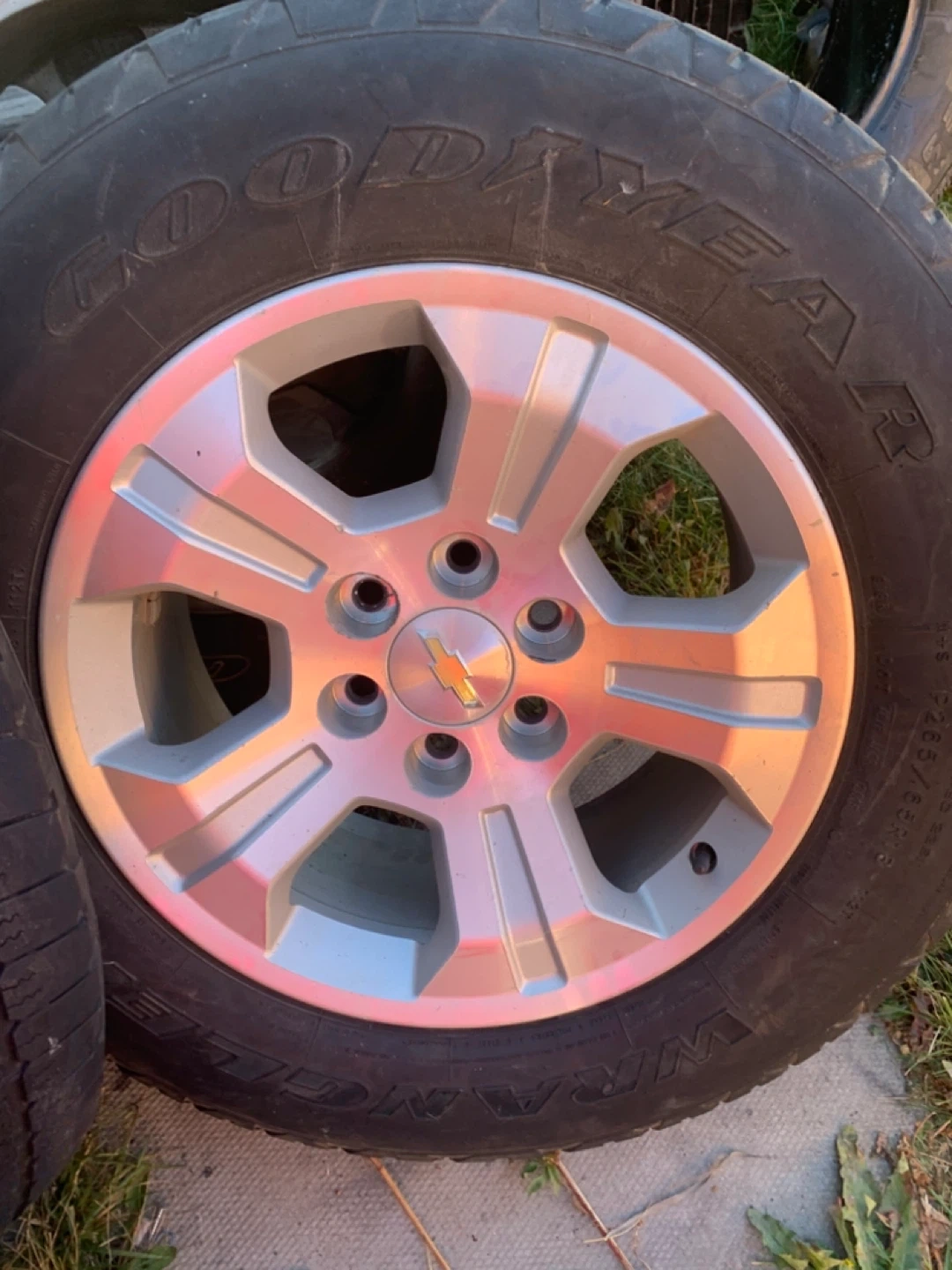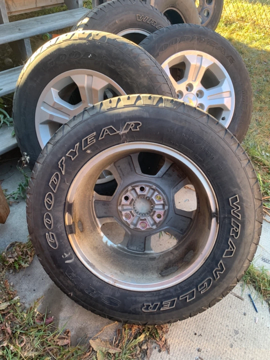 Selling a set of Goodyear Wrangler tires, size P265/65R18, mounted on Chevrolet rims. They're marked M+S and have the TPC SPEC 2361. Ready to go onto your truck or SUV!