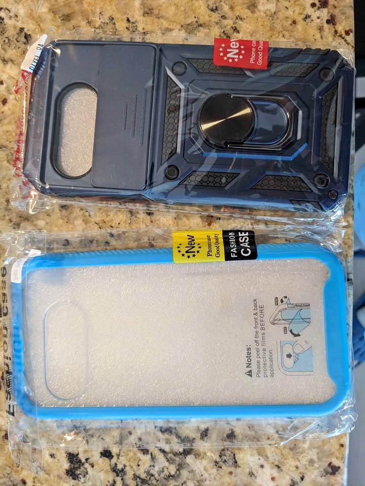 Light blue phone case is a full encased waterproof (not sure how water proof it actually is...) case and the dark blue case comes with a camera protector and kickstand. $5 for the dark blue and $10 for the light blue. Take both for 12$