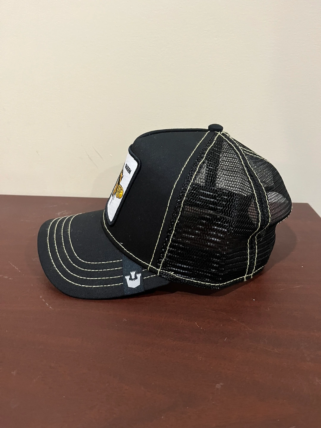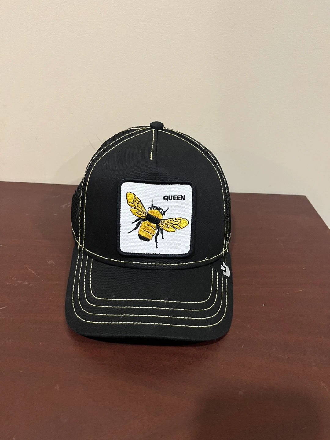 Check out this Goorin Bros. Queen Bee trucker hat! It's black with a cool bee design on the front. Perfect for adding a bit of style to your everyday look. The hat has a mesh back, making it super comfy for warmer weather!