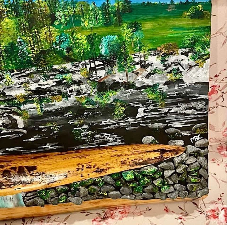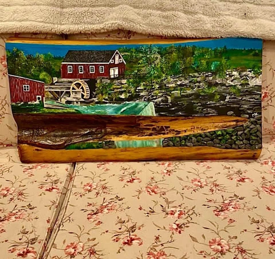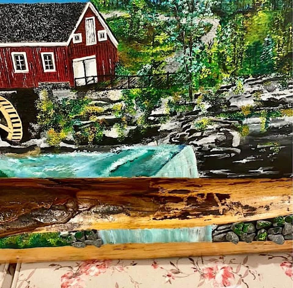 BRAND NEW Original by Mary Burke on live edge wood. “Morningstar Mill” Artist in St Catherines, Ontario Includes real rocks and 3-D effects Cottage cottagecore rustic decor home Christmas gift art paint painting original handmade artwork