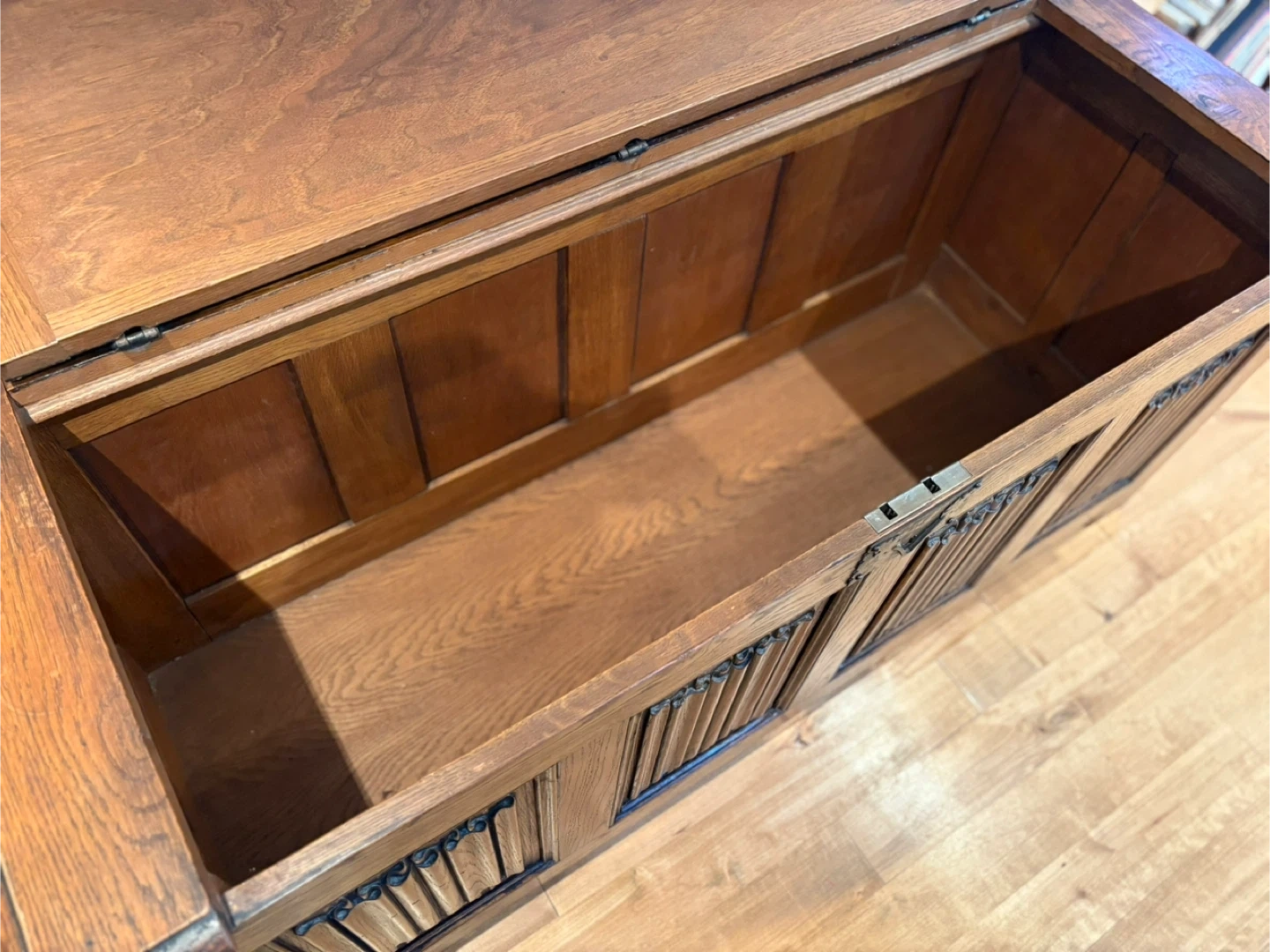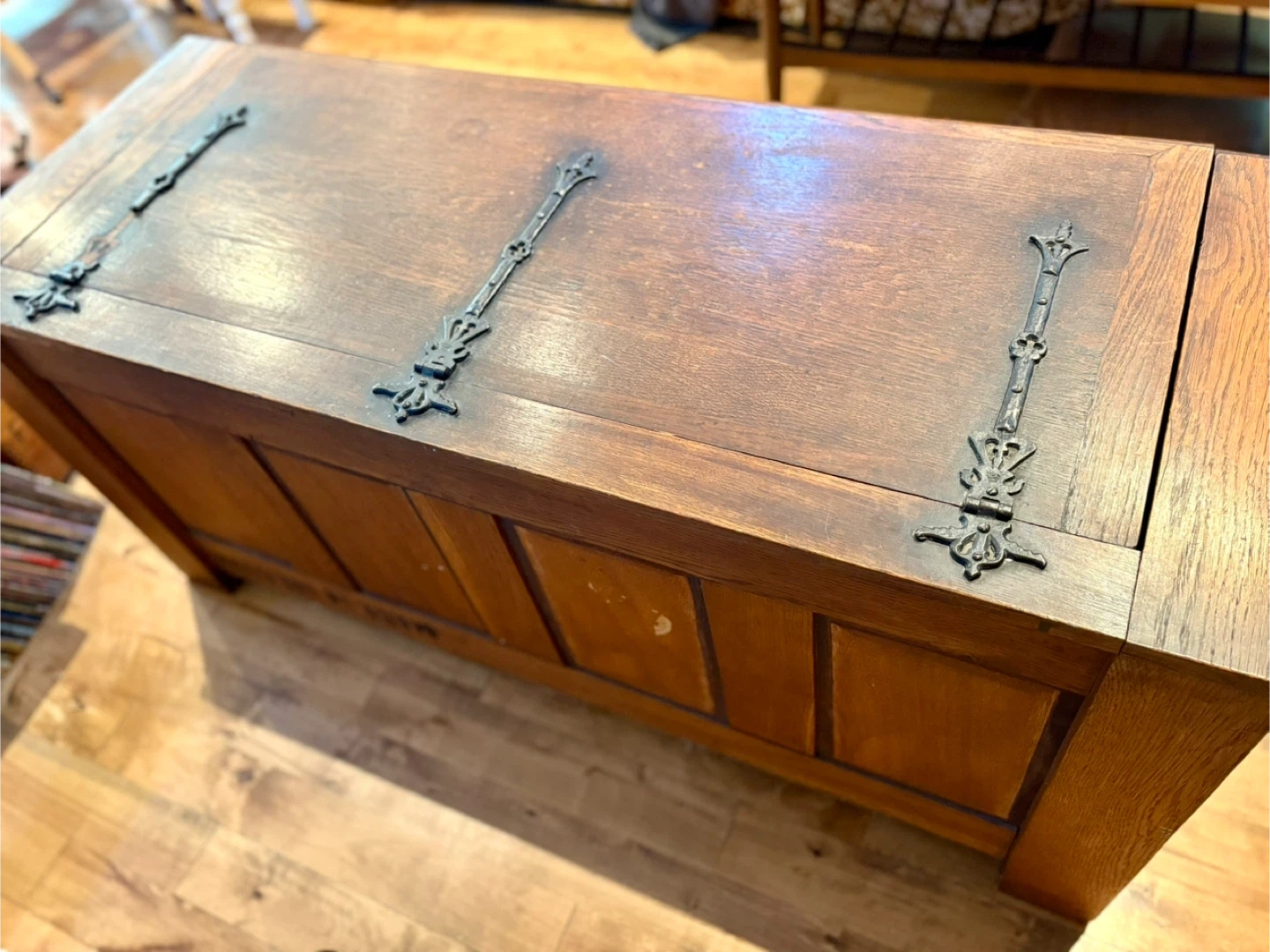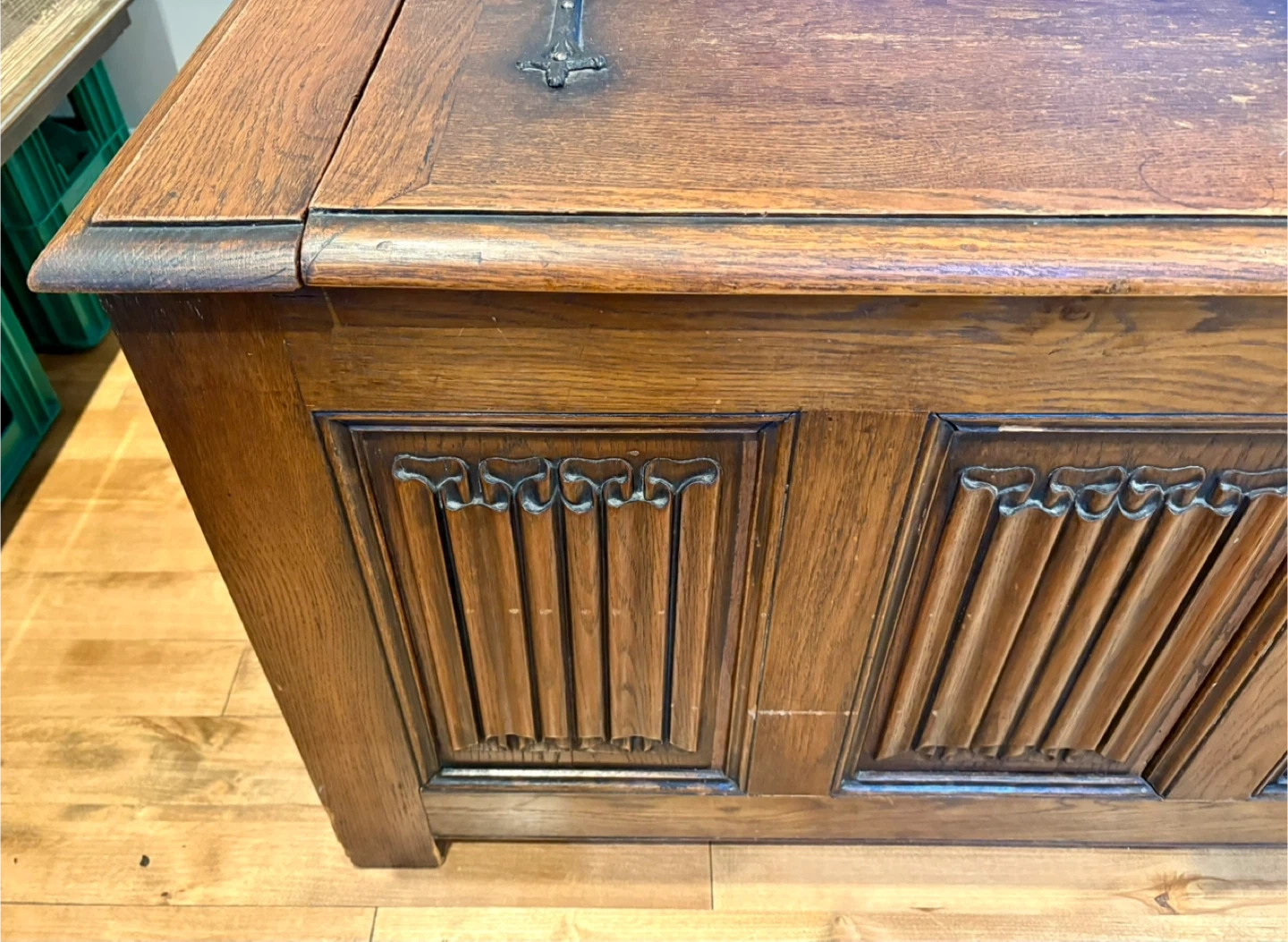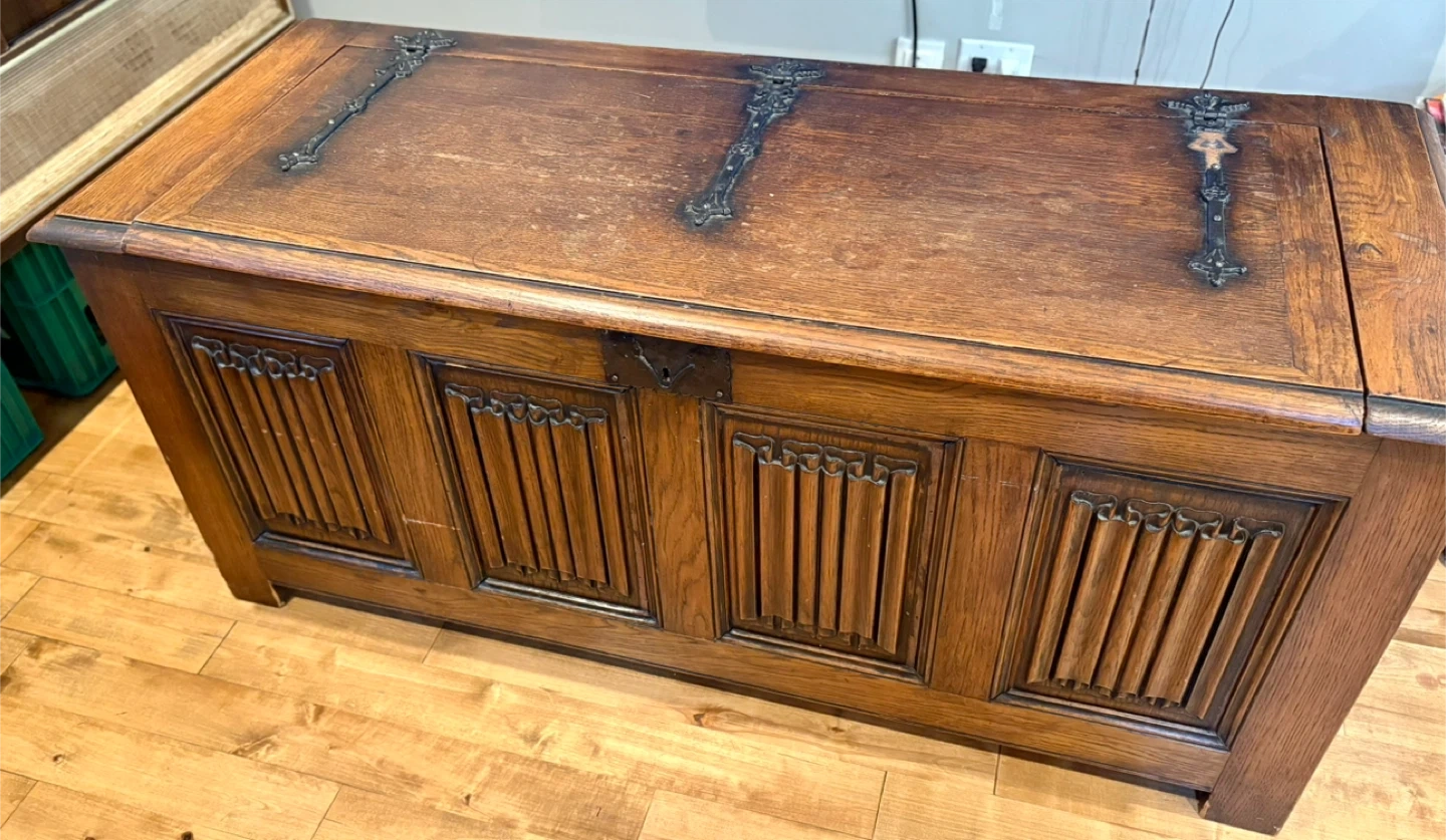 Gorgeous wooden storage chest with charm and character. “Made in Belgium” stamp on back, beautiful carvings on front. Large with ample storage inside. Very good vintage condition. Opens and closes smoothly/no sqeams or odour issues. Dimensions: 52.5L x 20.5D x 23.5H Pick up only near Bermondsey & O’Connor. Will require two people and a truck. Cross-posted