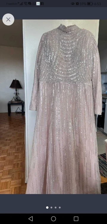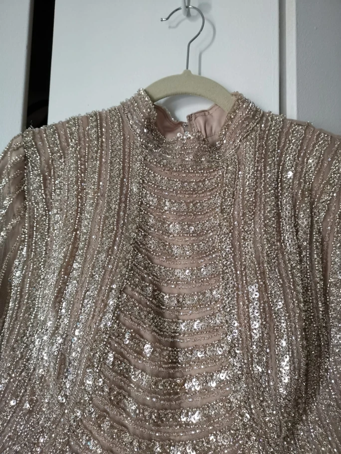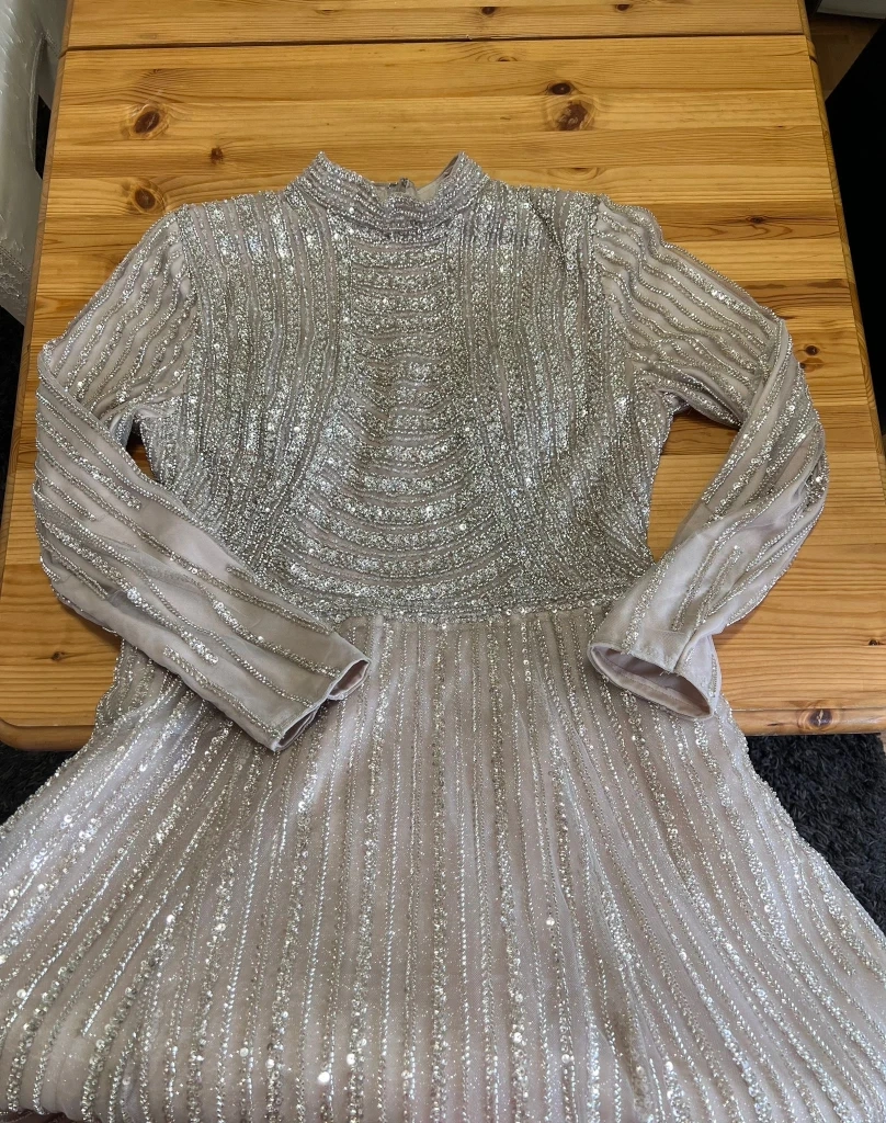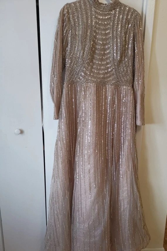 Long sleeve, floor length, high neck maxi dress. Features heavy embellishment. Champagne/light beige colour. Elegant and formal. Used indoor only once. Excellent condition