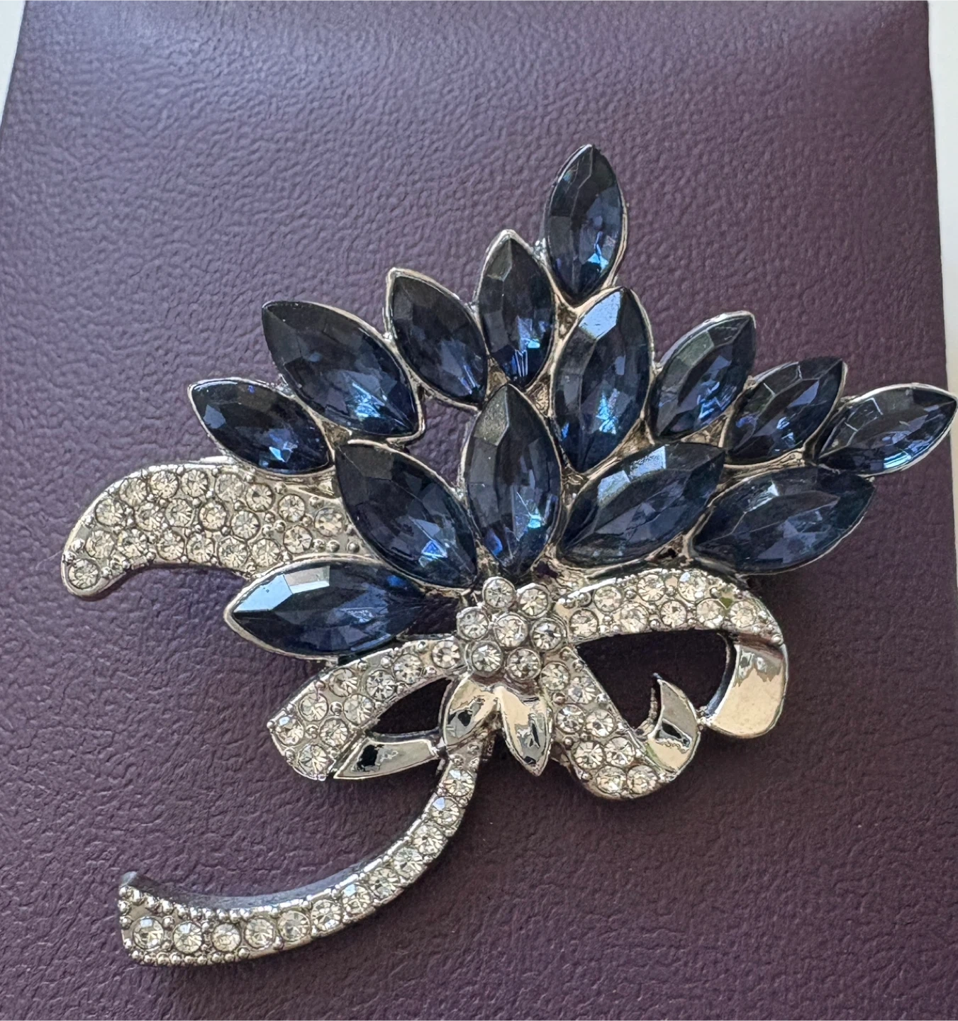 Selling a lovely floral brooch featuring blue stones and clear rhinestones. It's in great condition and would be a beautiful addition to any outfit or collection.