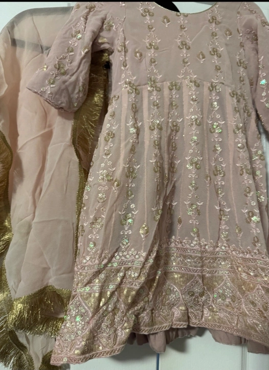 Beautiful blush pink three-piece suit. Embroidered detail throughout. Includes a long kurta, trousers and dupatta. Delicate gold accents. Perfect for special occasions.