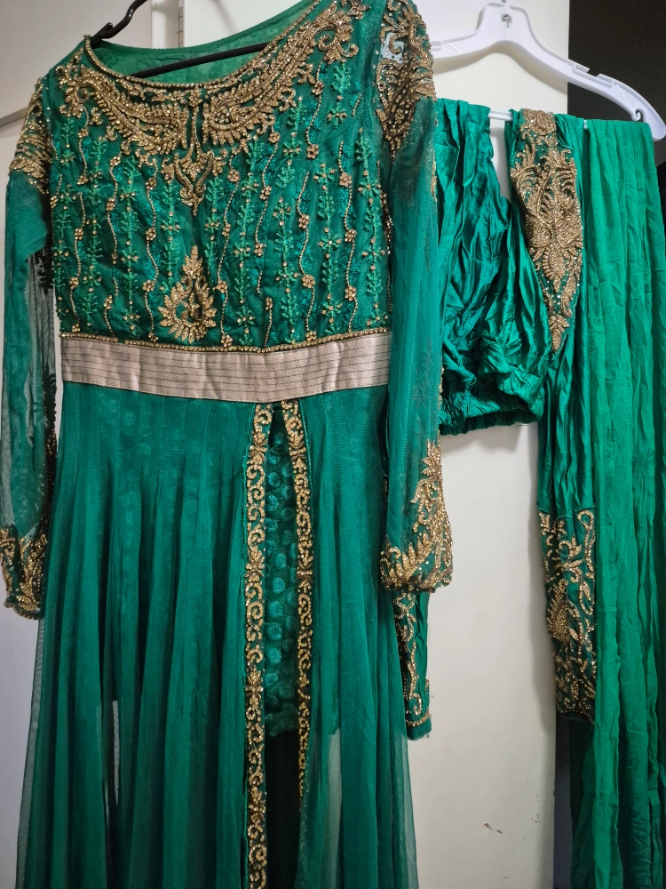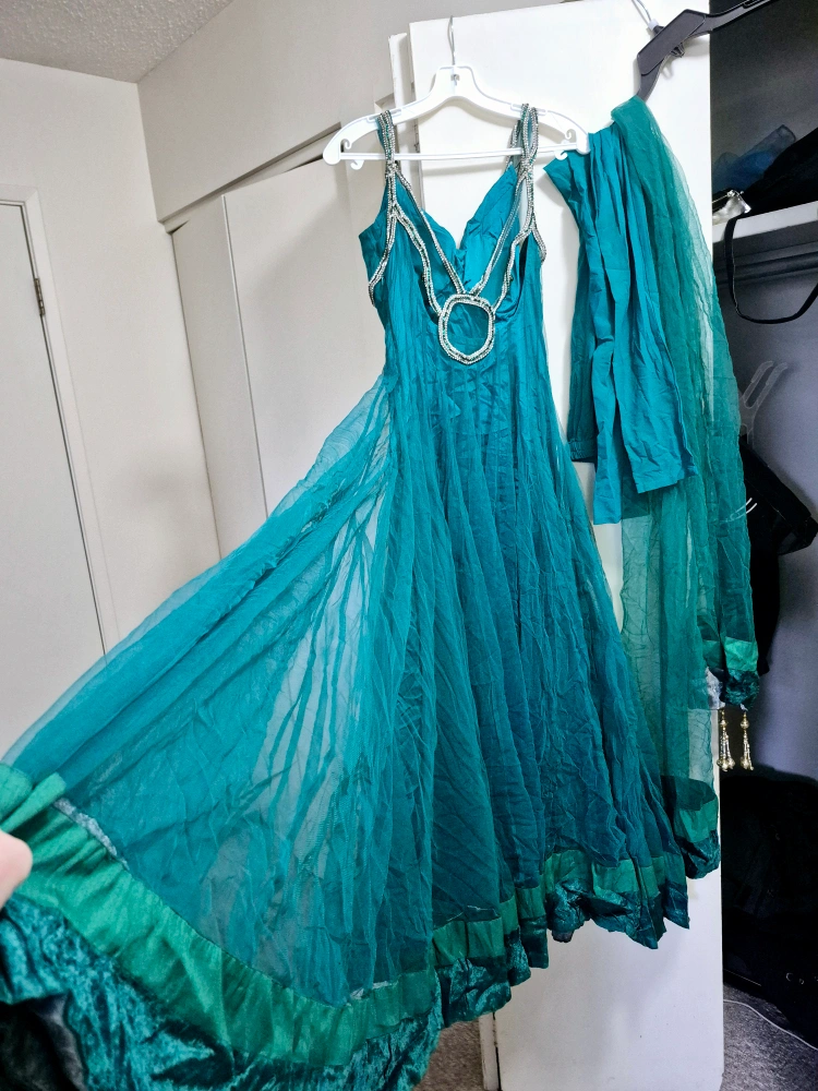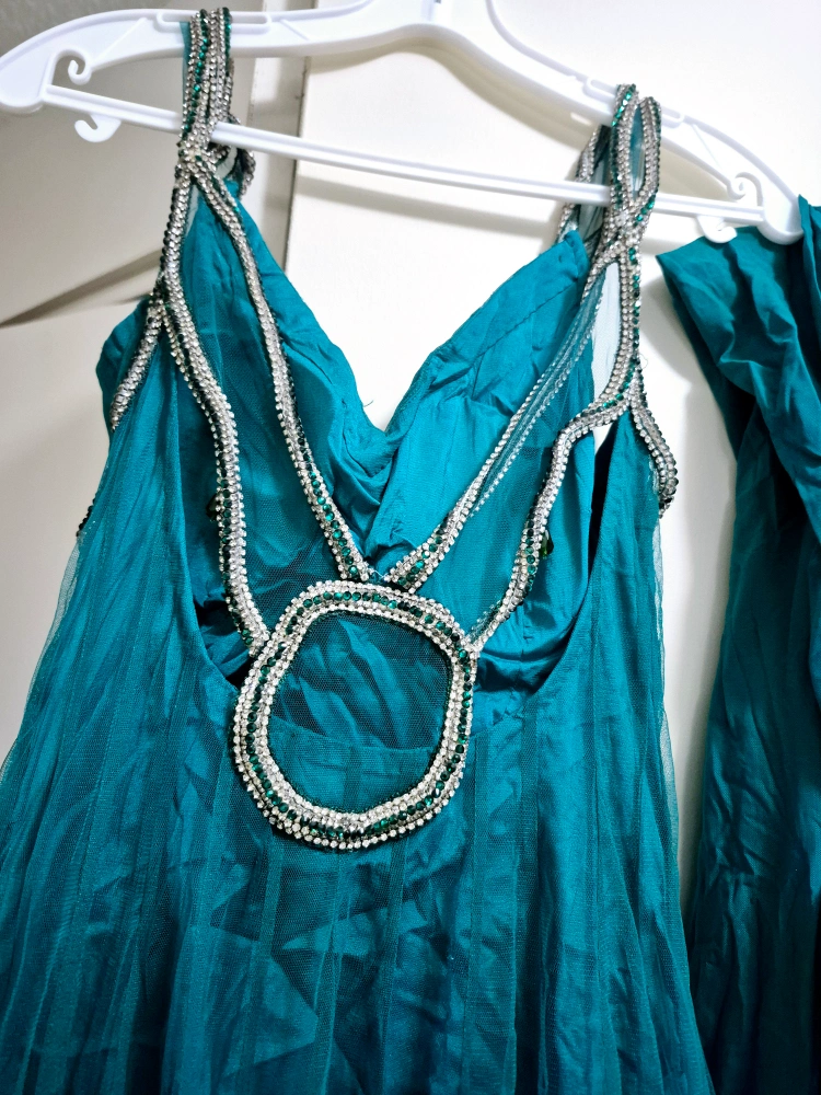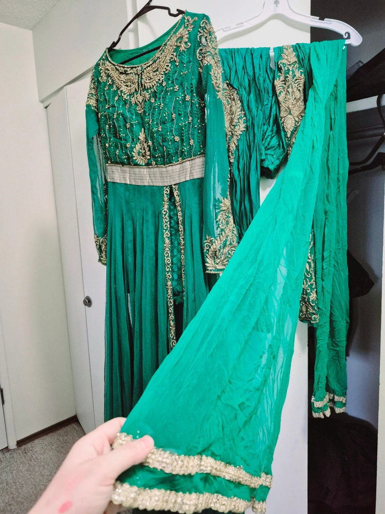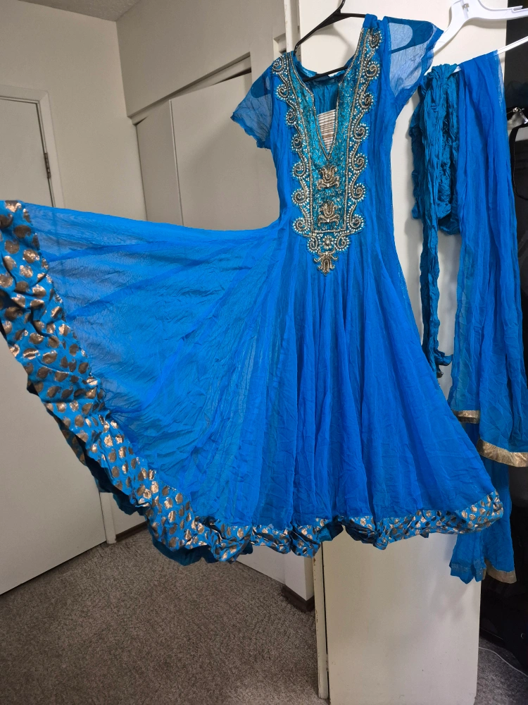 Each dress 120 dollar Beautiful teal and blue South Asian salwar kameez sets. Intricate gold and silver embroidery. Includes kameez, salwar, and dupatta. Stunning for special occasions. Various styles available.