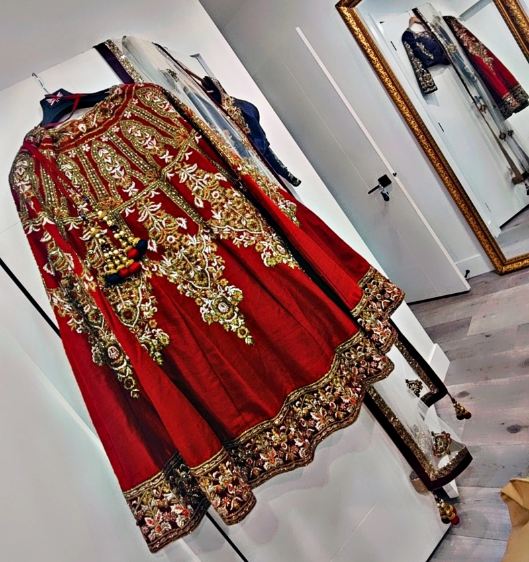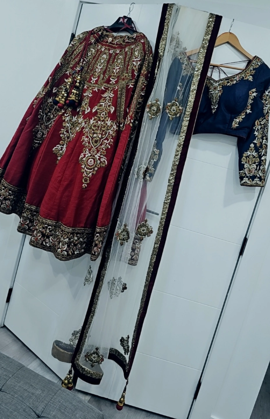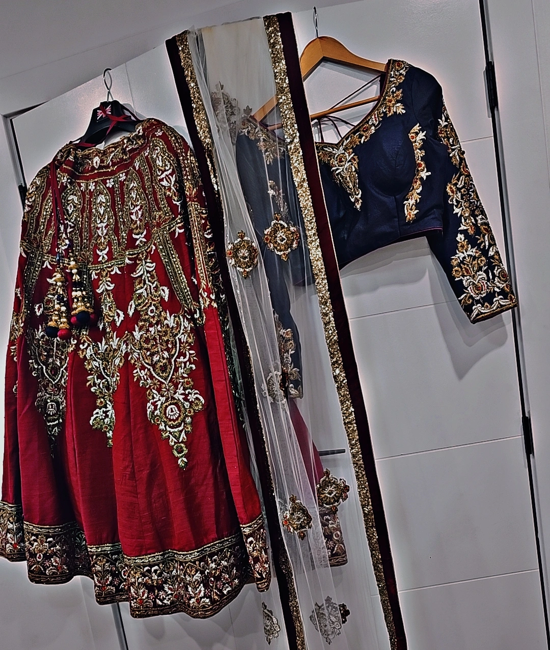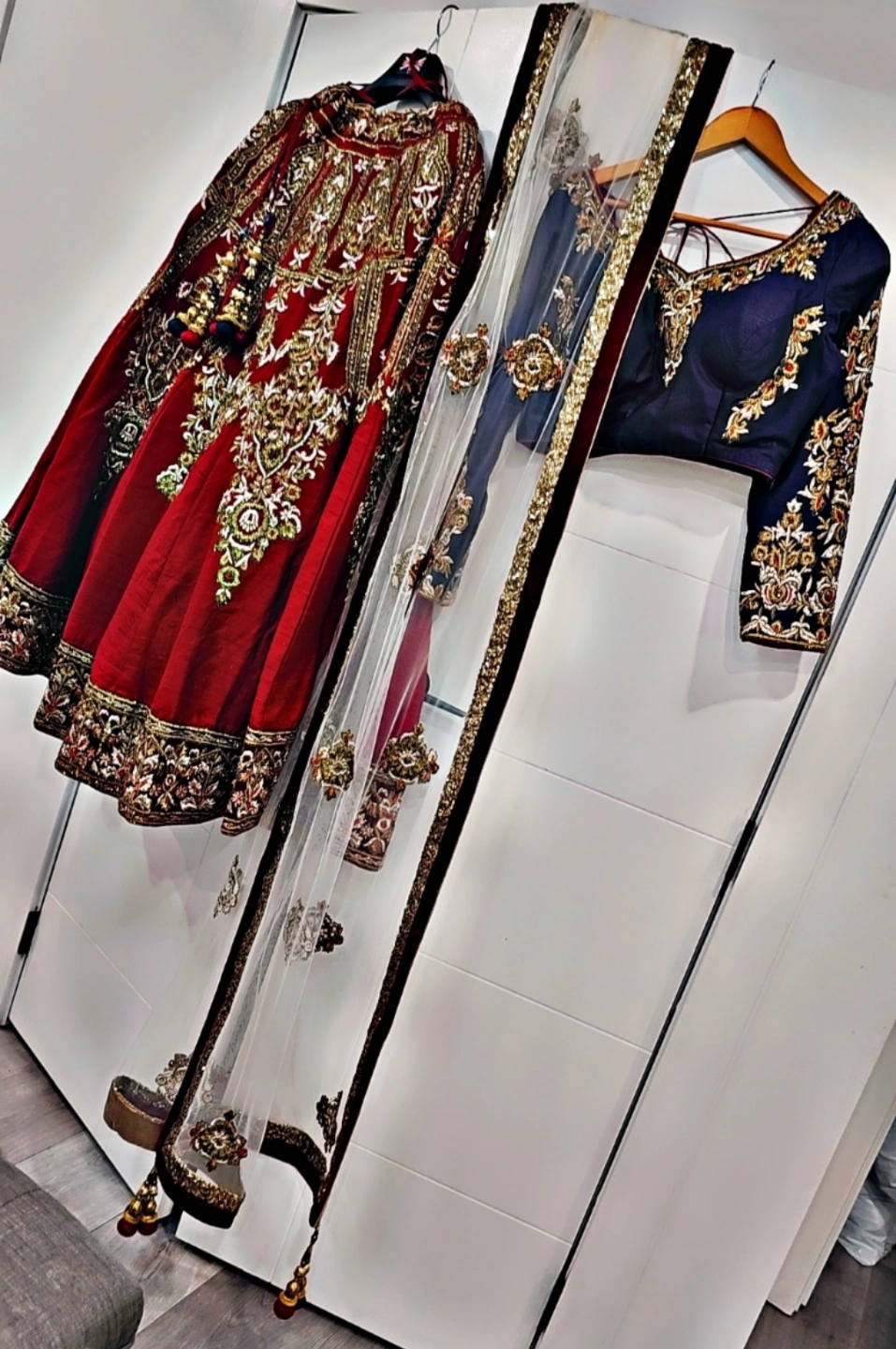 Stunning bridal lehenga choli. Features a maroon skirt, intricately embroidered blue choli, and a sheer dupatta. Embellished with gold and silver detailing. Perfect for a wedding or special occasion.