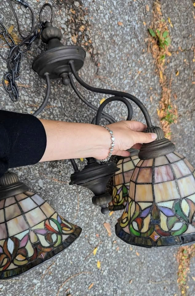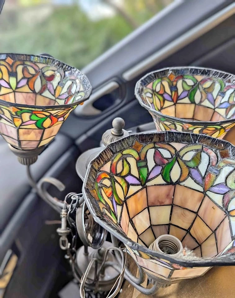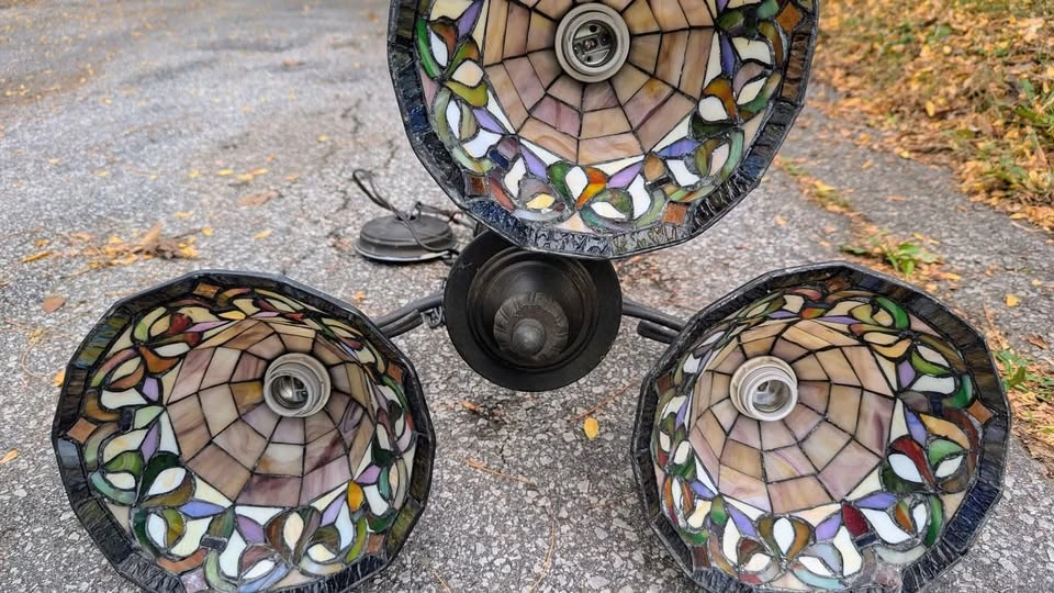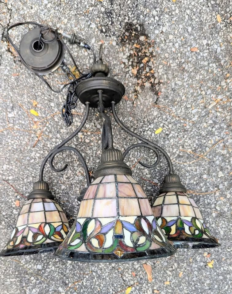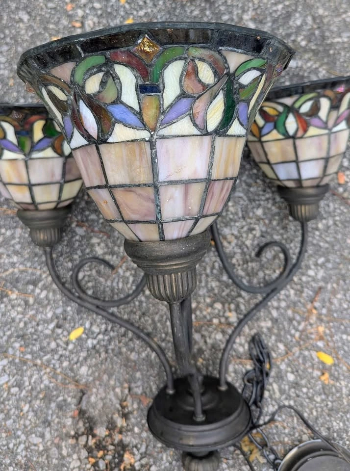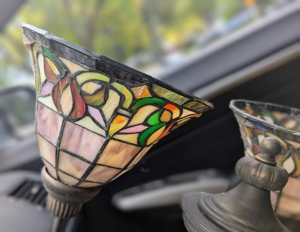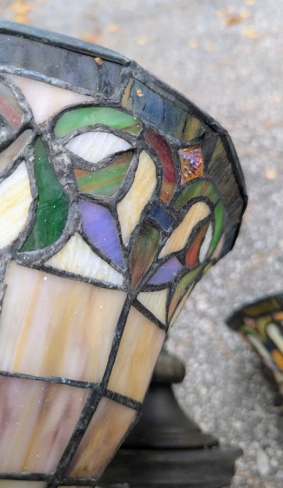 Beautiful!! Glass and hardware intact , very lovely colors, soft lavender being and green palettes.