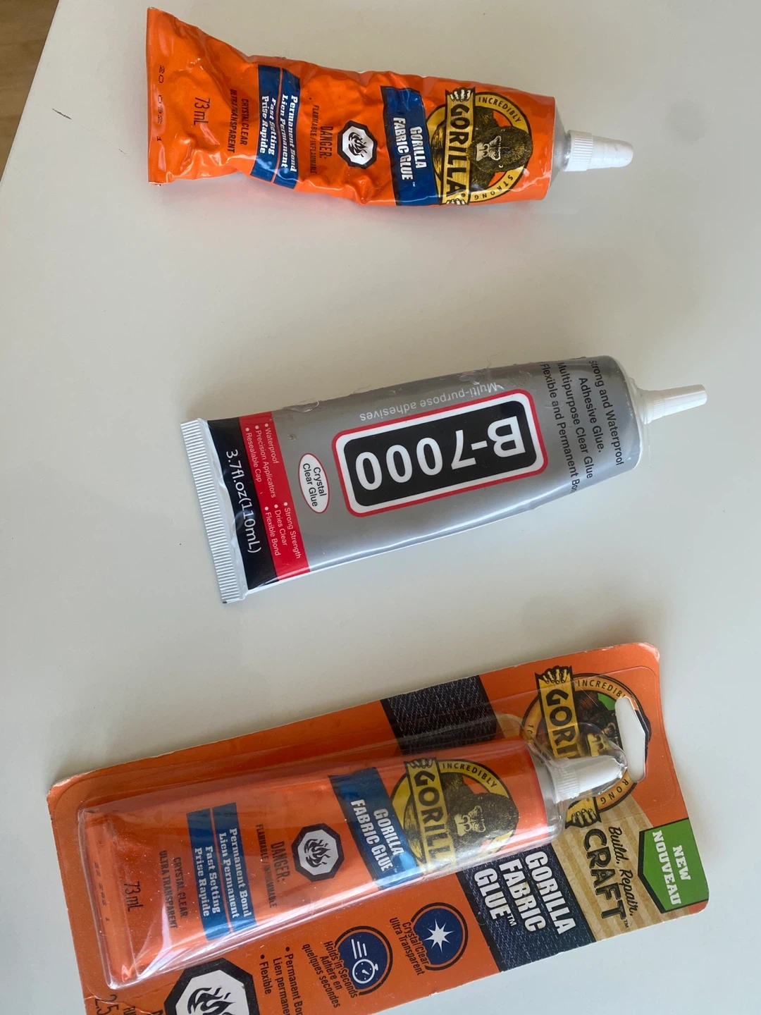 Selling Gorilla Fabric Glue (73ml) and B-7000 multipurpose adhesive (110ml). The Gorilla Fabric Glue is crystal clear and ultra transparent, creating a permanent and flexible bond. The B-7000 is strong, waterproof, and has a precision applicator.