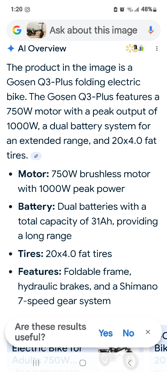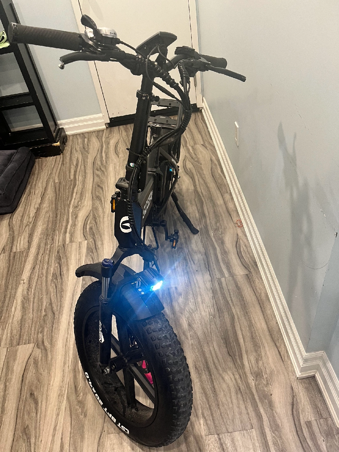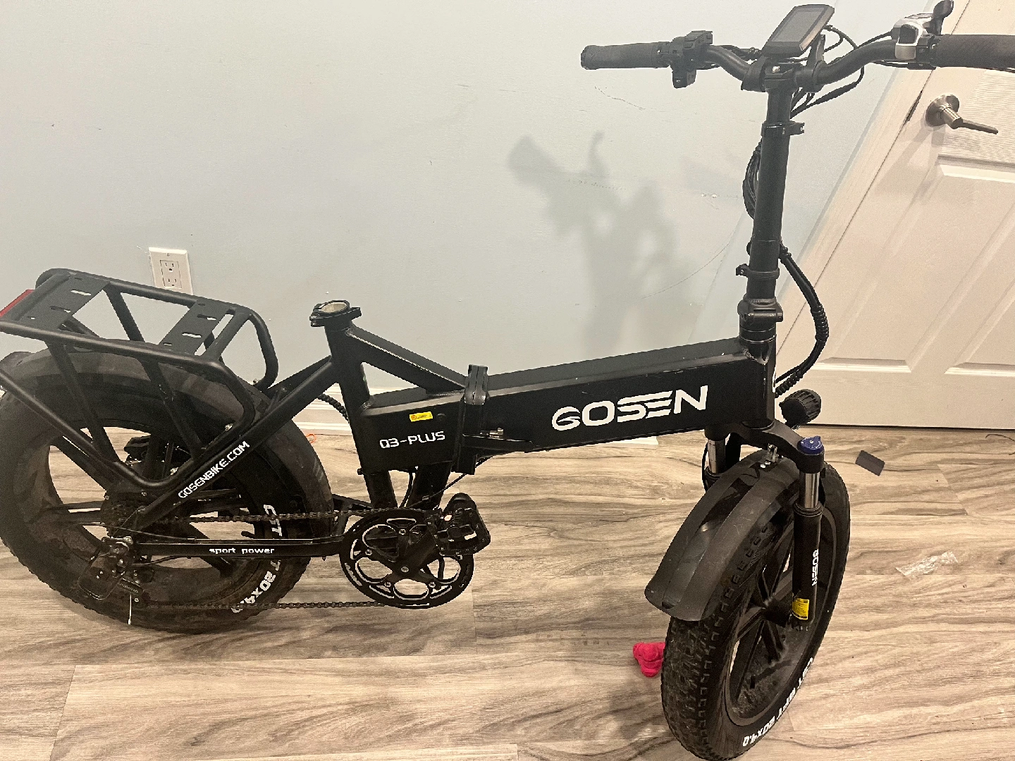 Selling a Gosen Q3-Plus folding electric bike. It features a 750W motor with a peak output of 1000W. It also has a dual battery system for extended range, and 20x4.0 fat tires. It has hydraulic brakes and a Shimano 7-speed gear system no charger open to offers