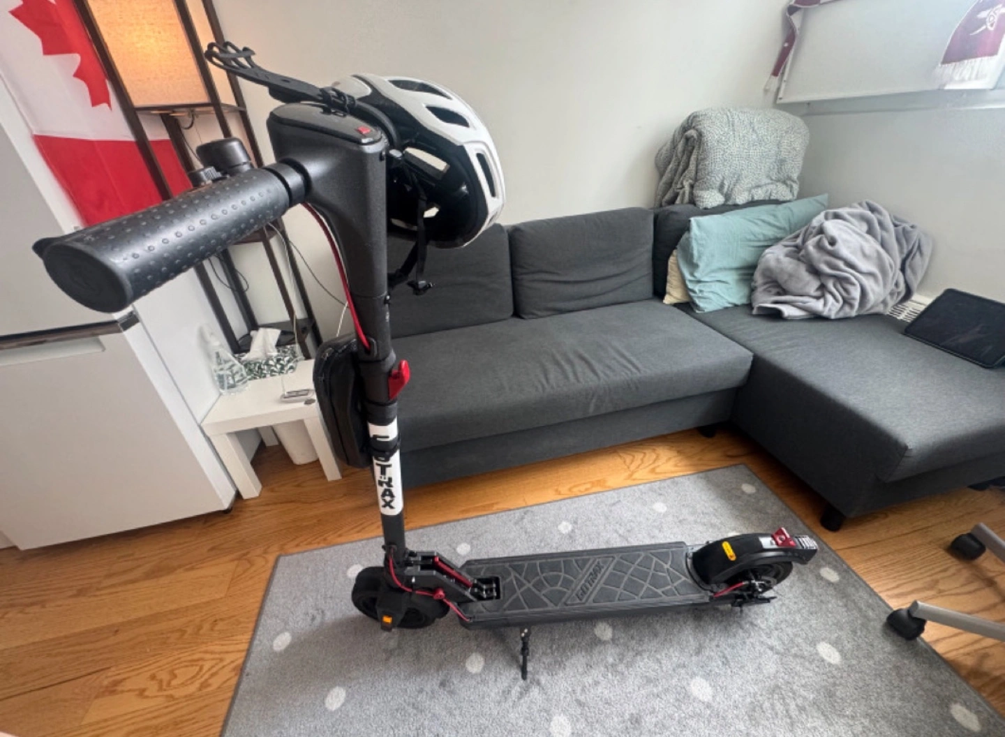 The scooter’s rear wheel is in a braking state and needs repair. It is sold as-is. Apart from this issue, all other functions work normally. Comes with the items shown in the photos, along with a small bag, a helmet, and a charger.
