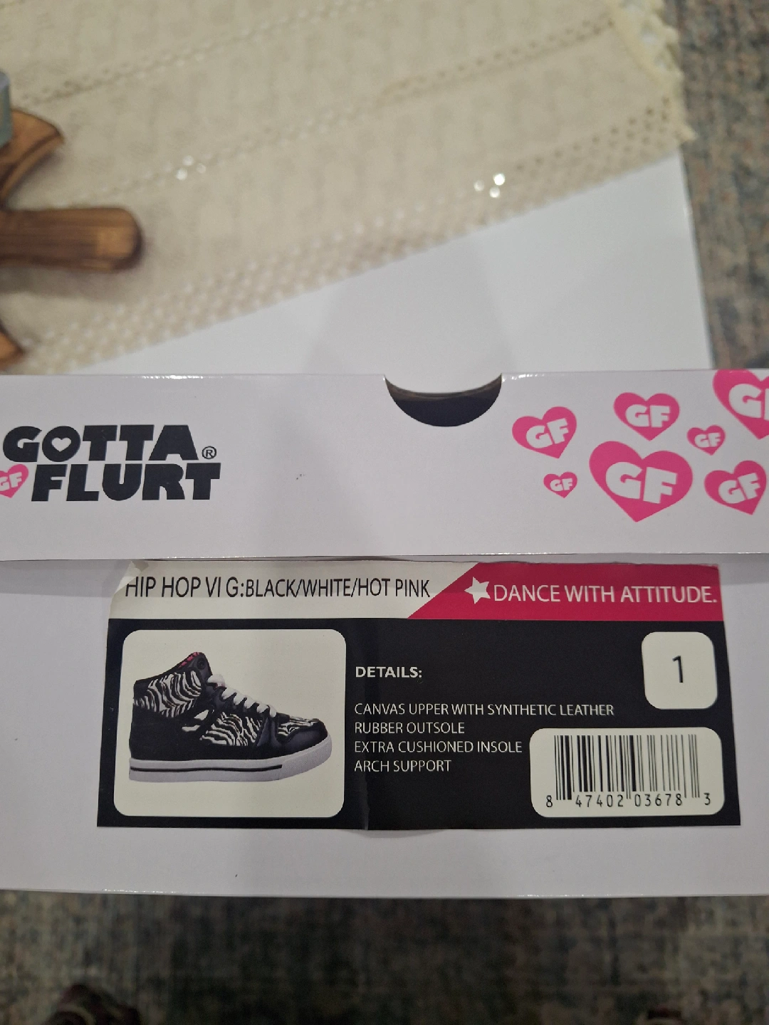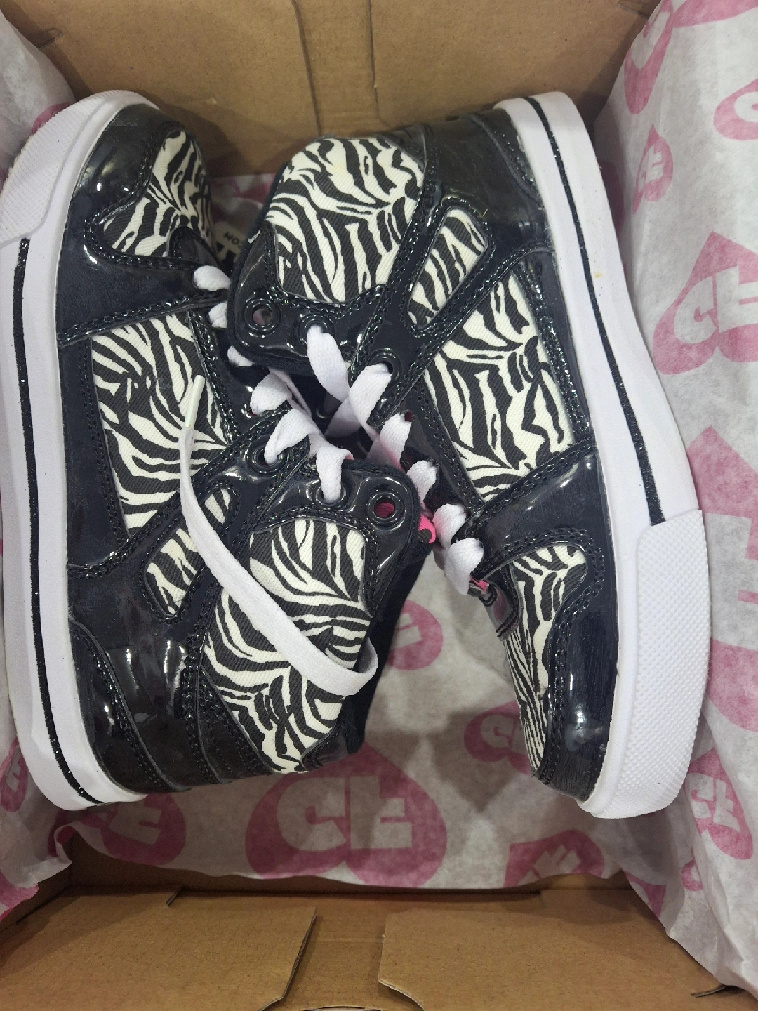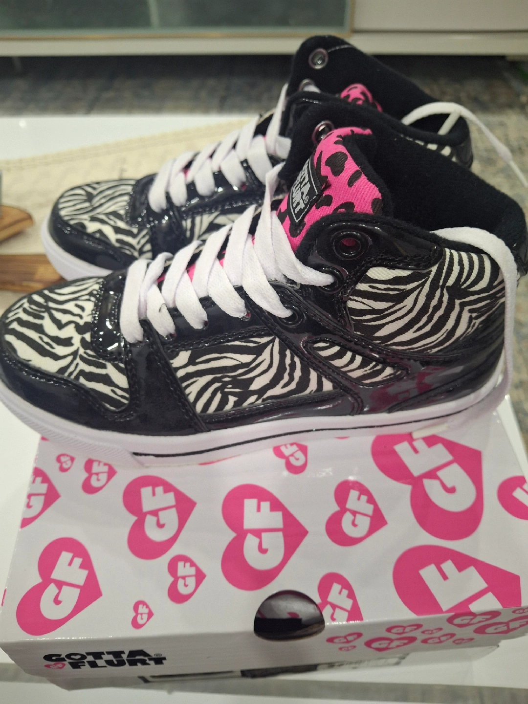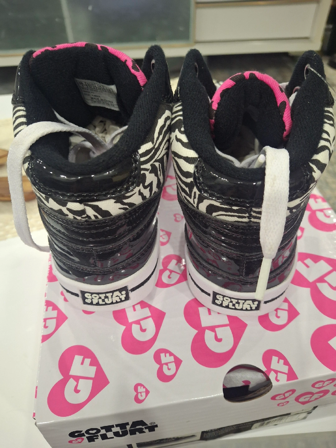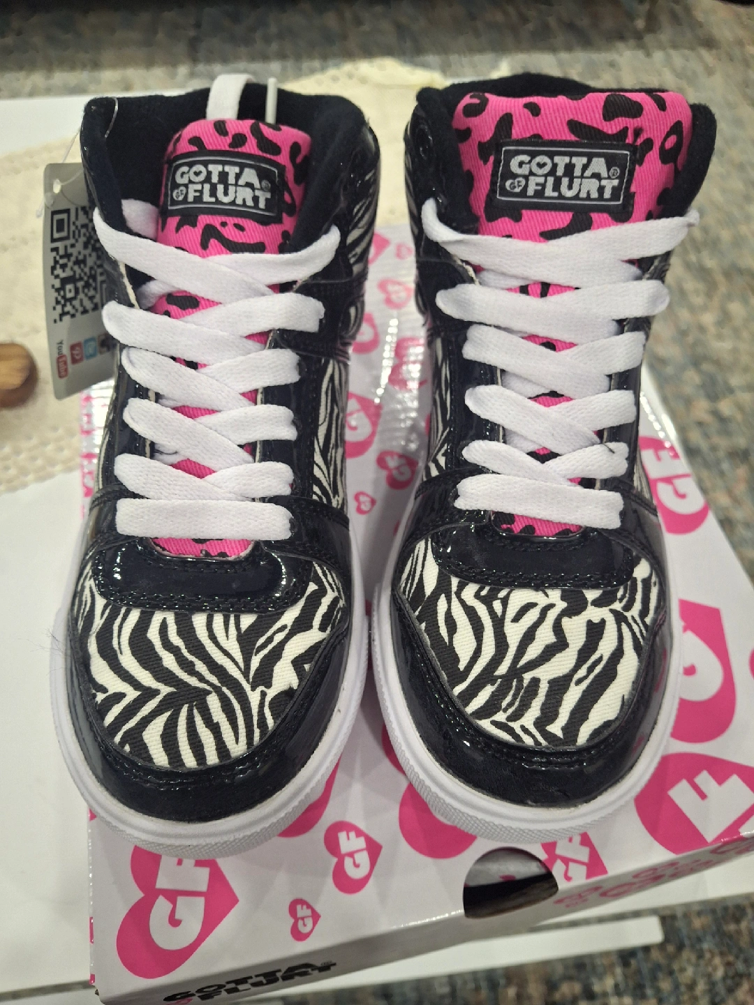 These Gotta Flurt high-top sneakers feature a fun zebra print! They have a black patent leather-look finish and pink accents. The shoes are in great condition and come with the original box size available 11,12,13,1,2,3,4