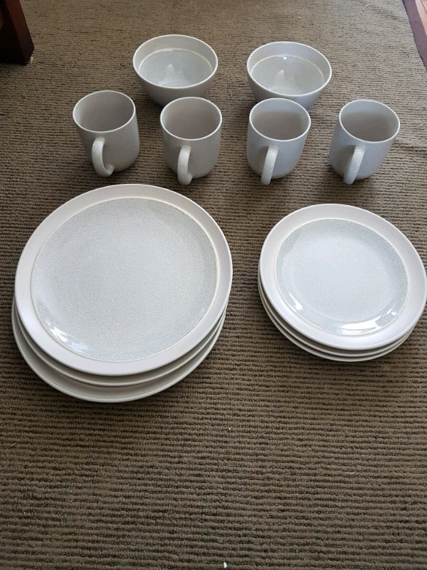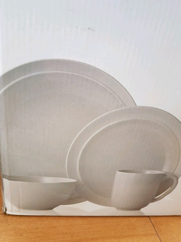 Brand new. Comes in a box. Microwave and dishwasher safe. Includes 3 dinner plates, 3 salad plates, 2 bowls, and 4 mugs.