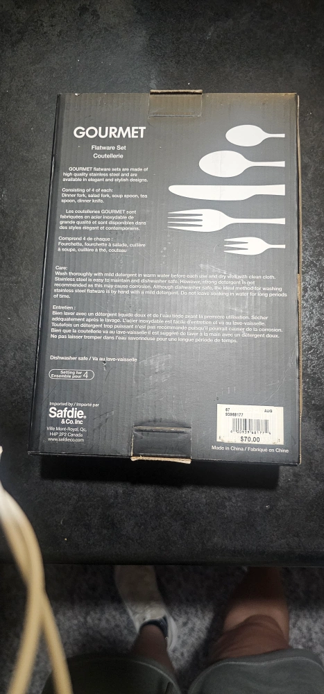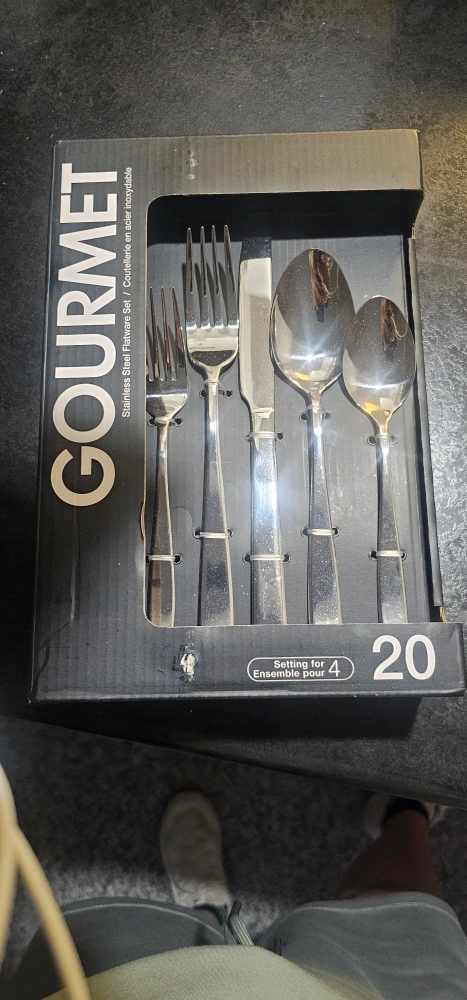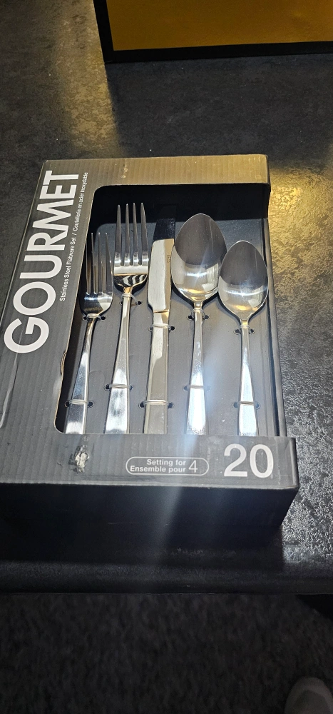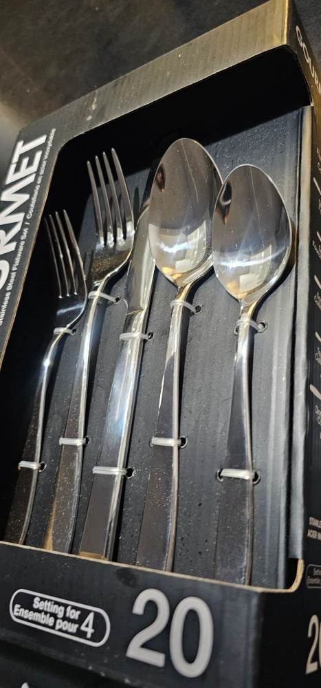 NEW Selling a Gourmet stainless steel flatware set, complete with service for four! This 20-piece set includes knives, forks, and spoons, all neatly arranged in their original box. Originally bought for $70, this set is perfect for everyday use or special occasions