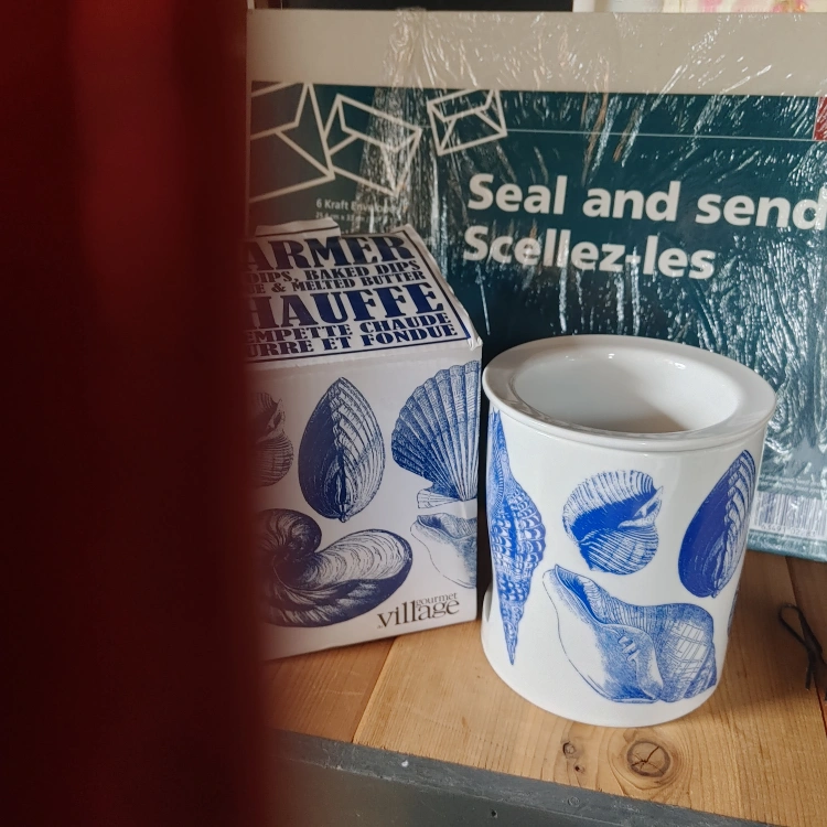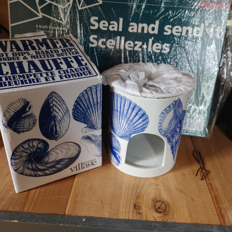 Selling a Gourmet Village warmer, perfect for keeping your dips and melted butter at the right temperature. It comes with the original box. The design features lovely blue seashell illustrations. It's in great condition and ready to use for your next gathering!