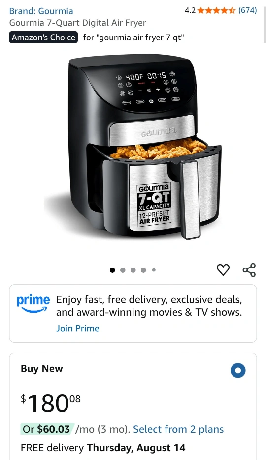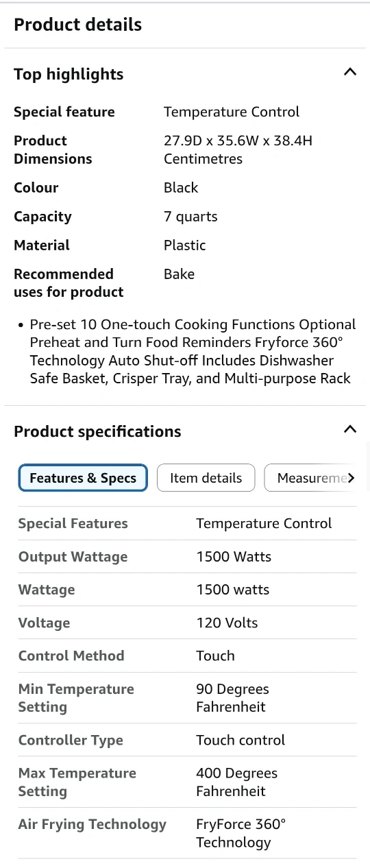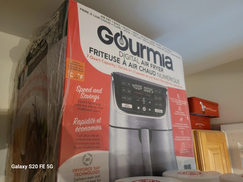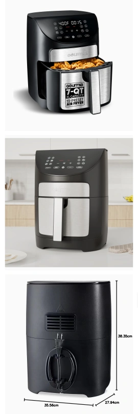 I'm selling a Gourmia 7-Quart Digital Air Fryer in black! It's in new condition with the original box. never open it. Key Specifications: - Capacity: 7 quarts - Dimensions: 27.9 cm deep x 35.6 cm wide x 38.4 cm high - Material: Plastic Selling Points: - Cooks faster and uses less energy than traditional ovens - Features Fryforce 360° Technology - Pre-set 10 One-touch Cooking Functions
