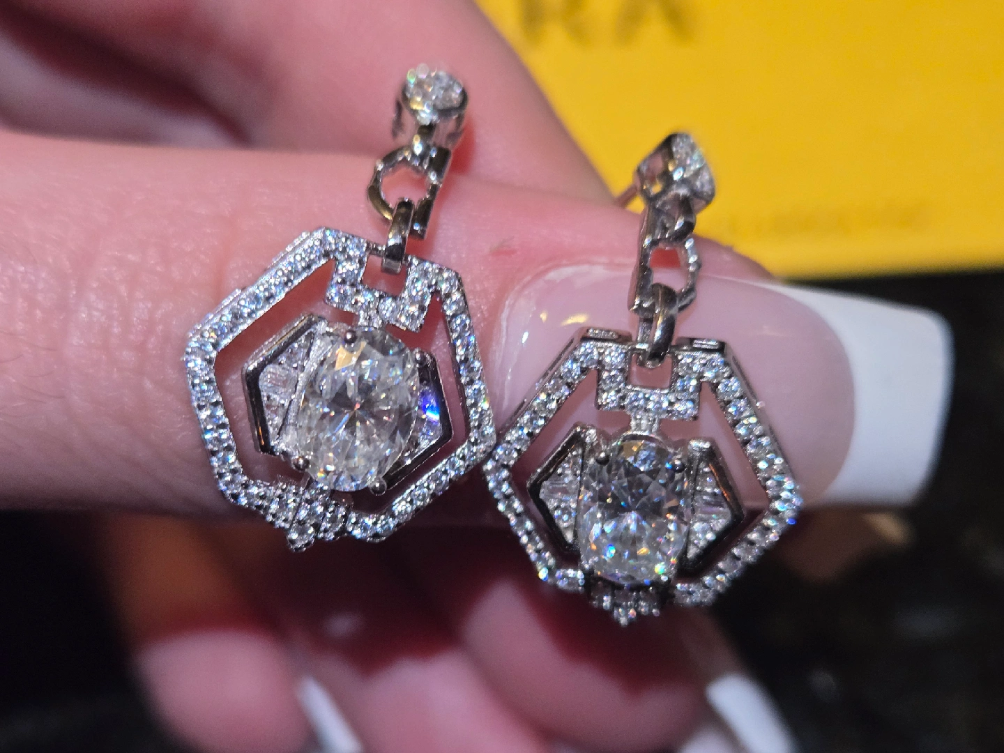 Selling a pair of GRA moissanite diamond earrings. They feature a unique geometric design with sparkling stones. Perfect for adding a touch of elegance to any outfit!