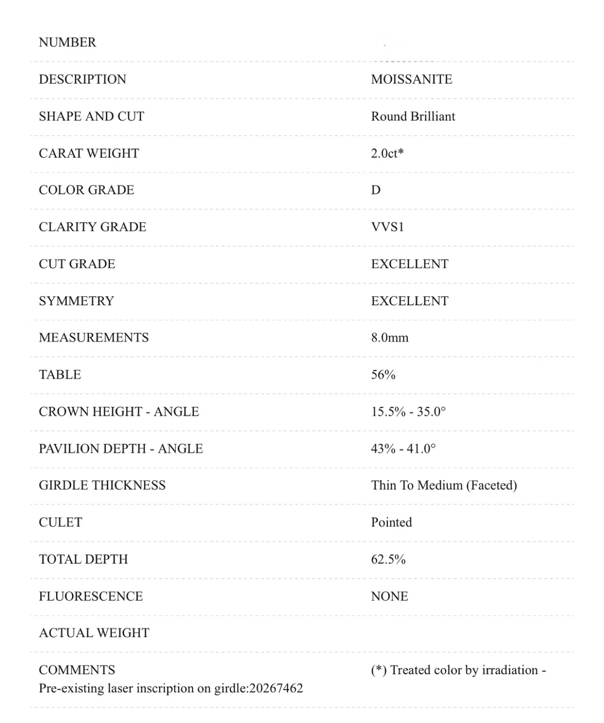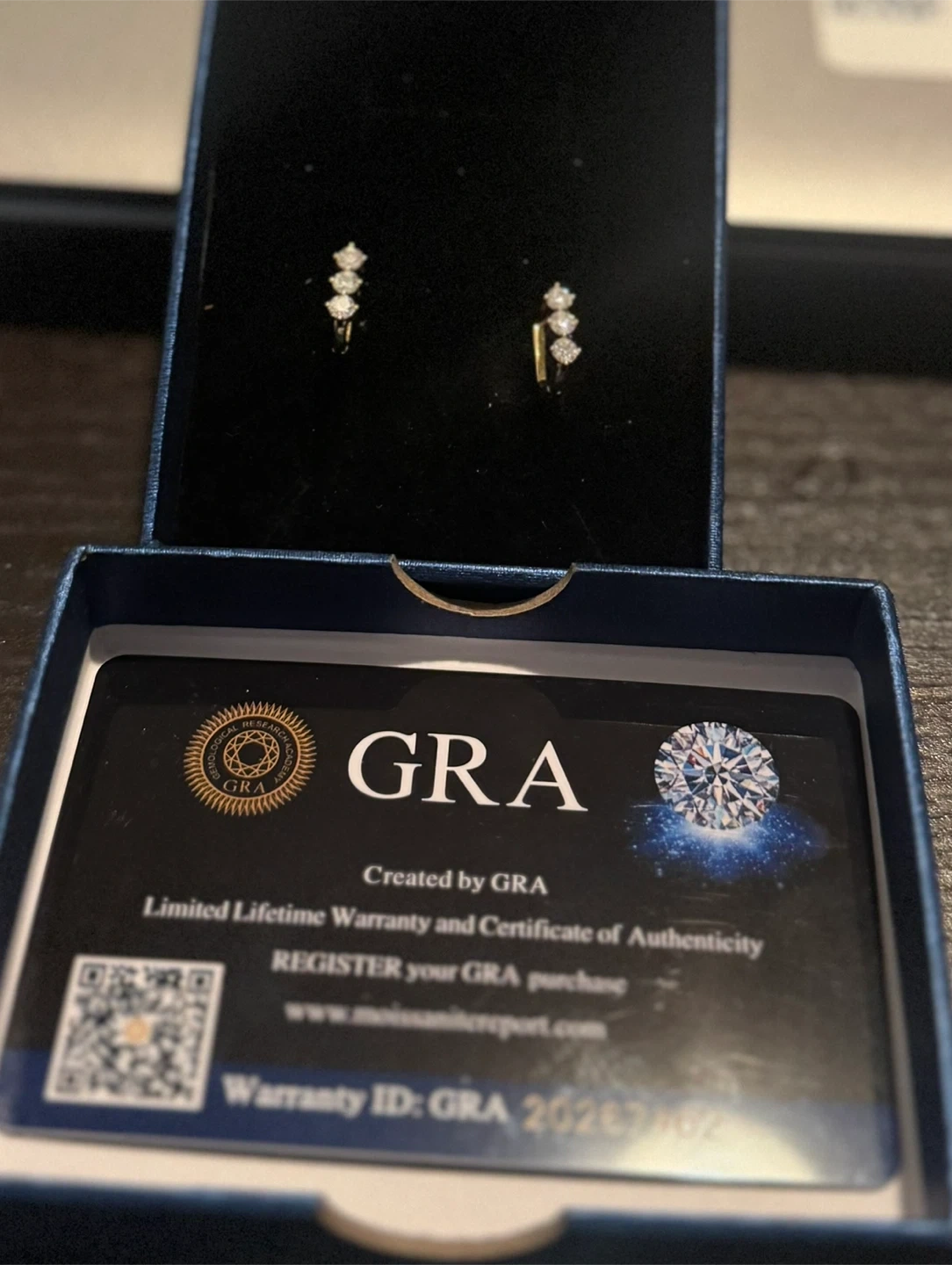 Selling a pair of new GRA moissanite diamond earrings! They're round brilliant cut, with a carat weight of 2.0ct each. The colour grade is D and the clarity grade is VVS1. They come with a limited lifetime warranty and a certificate of authenticity, plus the original box
