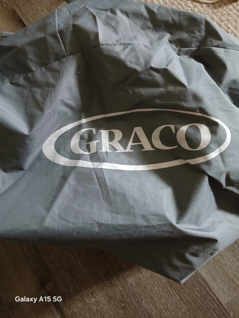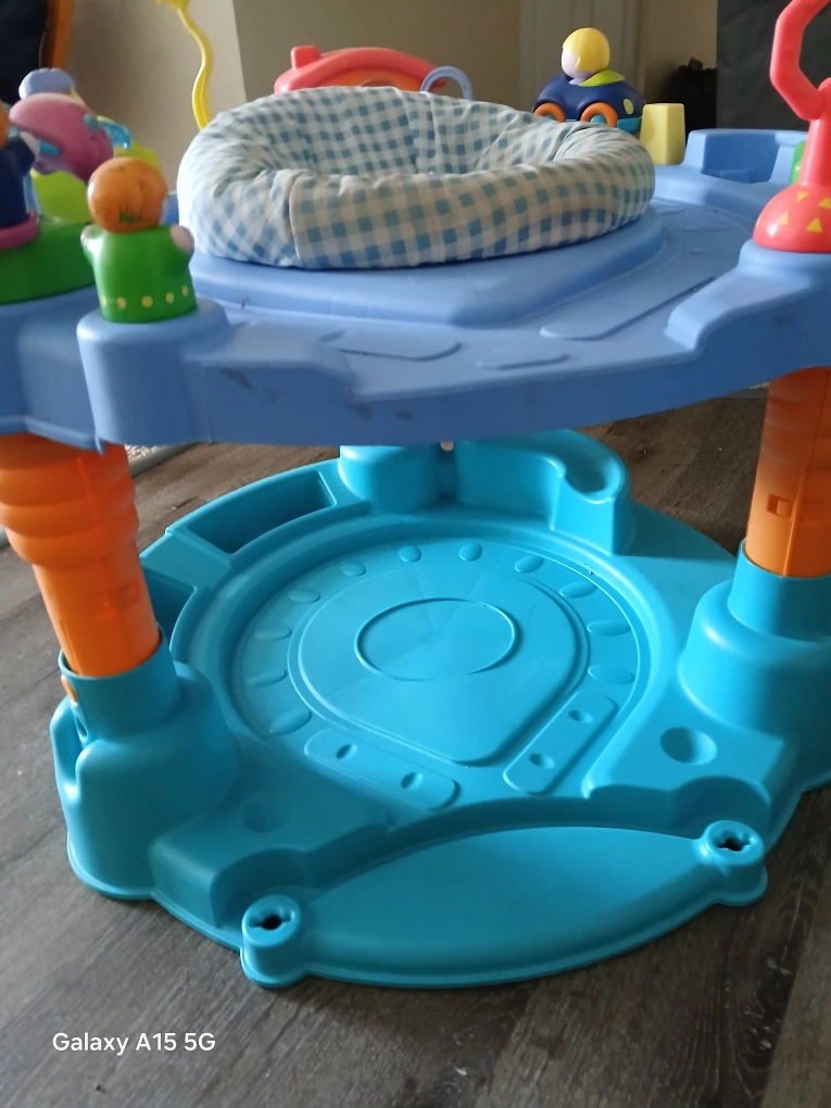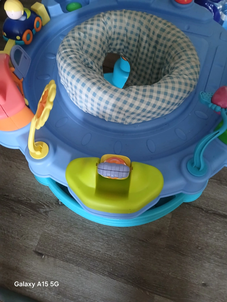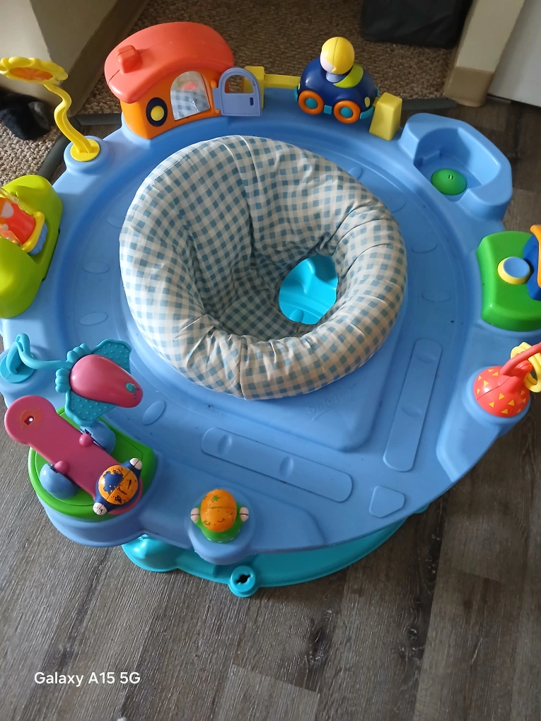 This is a Graco baby activity centre in good condition. It's perfect for keeping your little one entertained and active! The seat has a cute blue and white checkered pattern. It comes with a variety of colourful toys and activities to stimulate your baby's development. The Graco storage bag is also included!