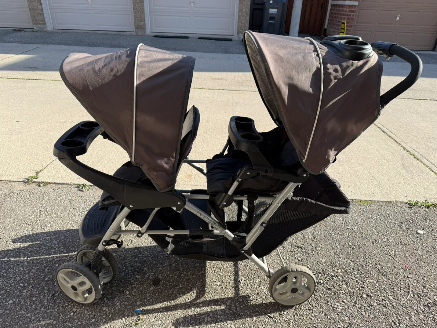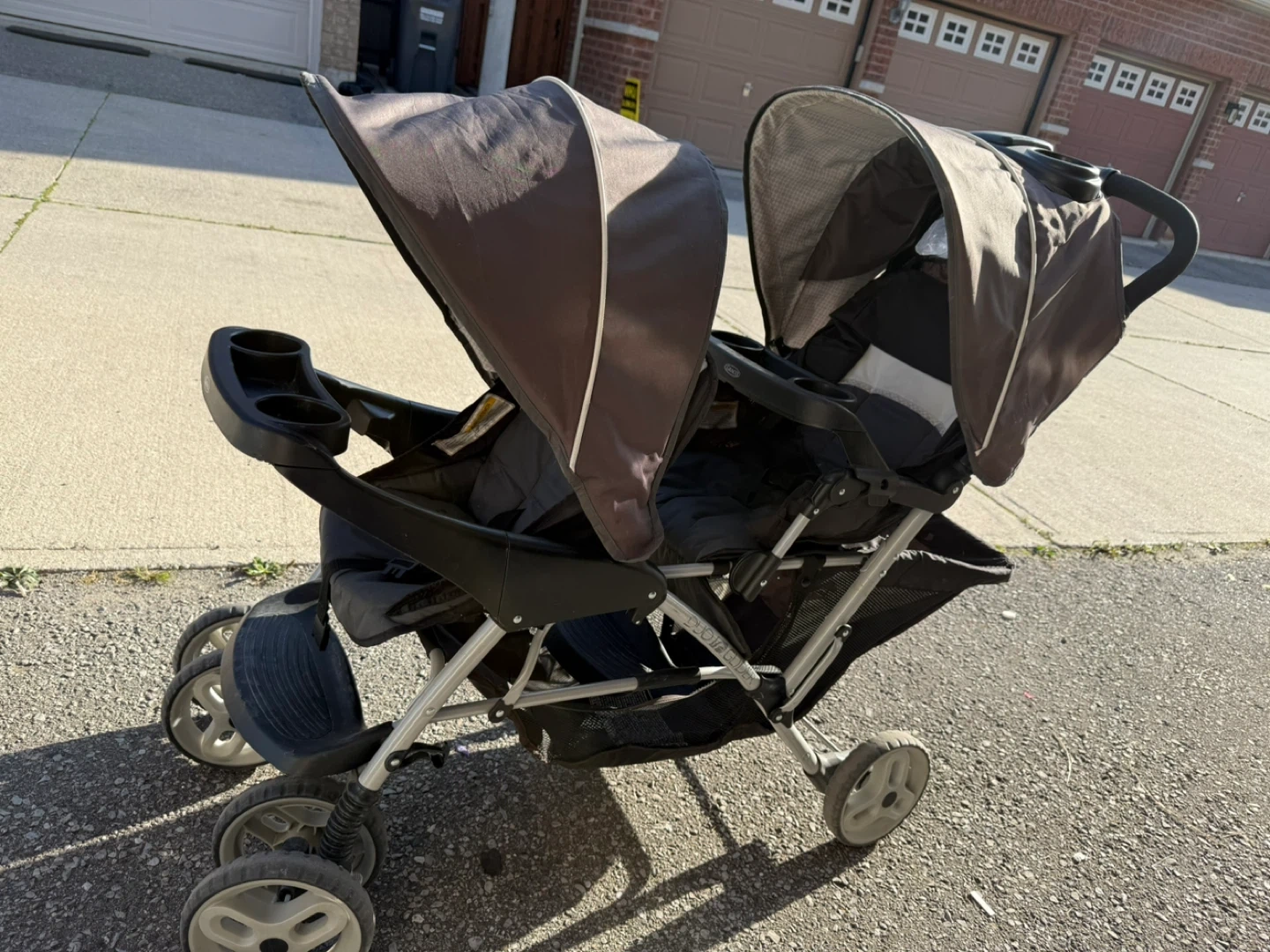 Selling a Graco DuoGlider double stroller. It's in good condition and ready for a new family! This stroller is great for twins or kids of different ages. It has multiple seating configurations to suit your needs and a large storage basket for all your essentials