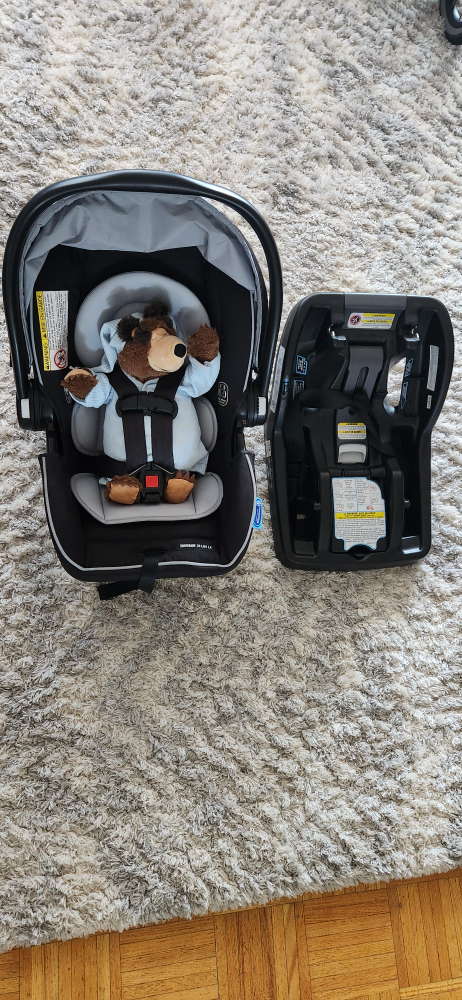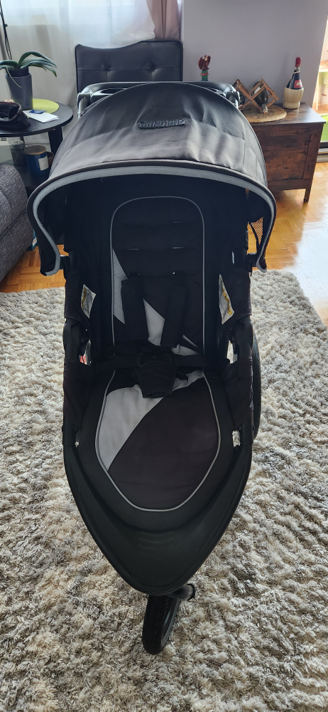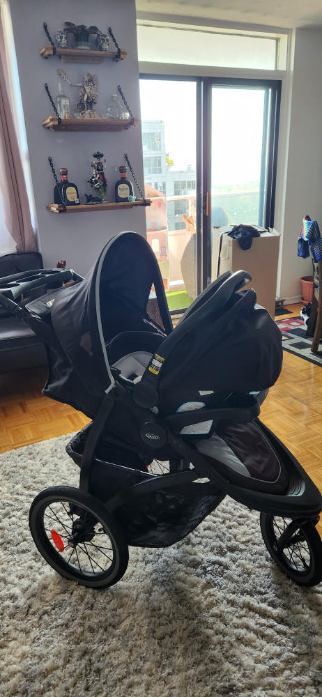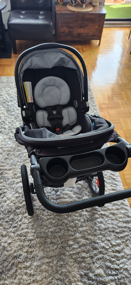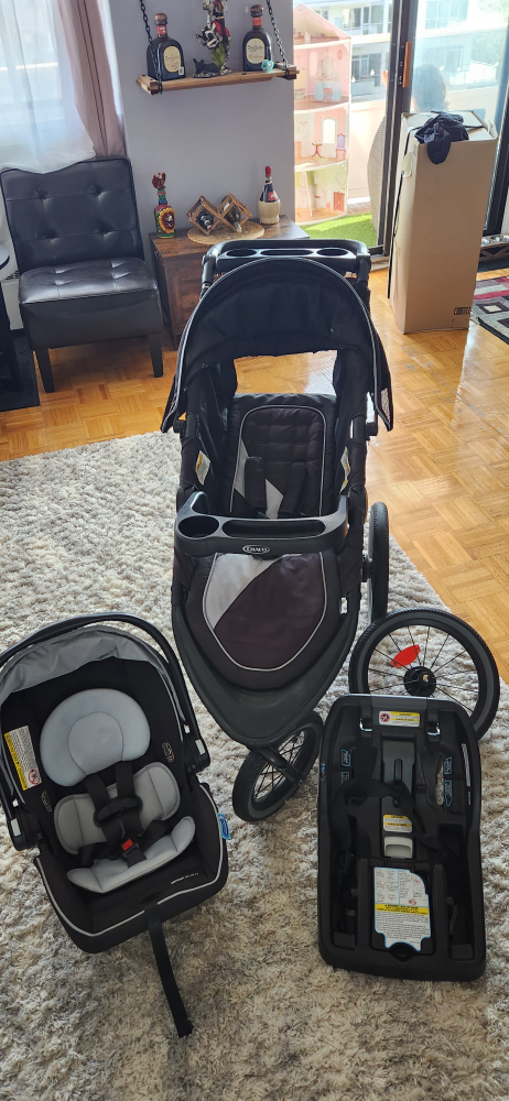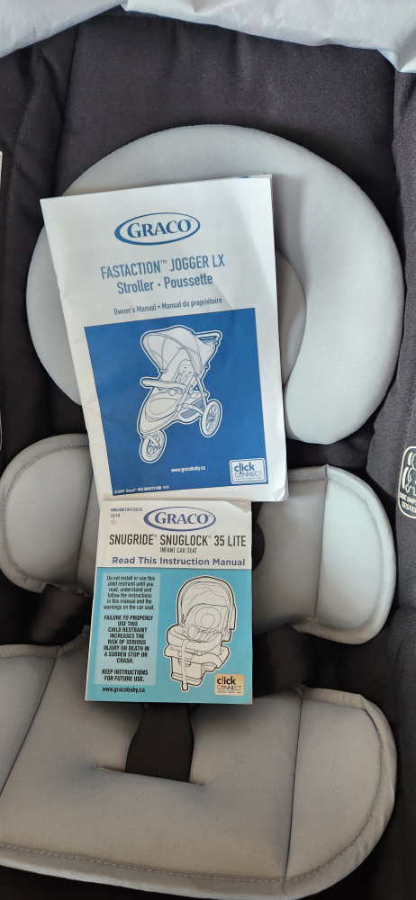 The Graco FastAction Jogger LX Stroller with SnugRide SnugLock 35 Lite Infant Car Seat is one of the best stroller/carseat combo on the market! Stroller (moderately used) - easily folded up and stays upright - extra large wheels make it easy to go out even in snow (personal experience) - front wheel can lock into place so it does not turn for jogging - safety leash prevents stroller to get loose - detachable front cupholder - double cuholder near handle - adjustable handle - peak window on shader - 5 point harness with shoulder and crutch pads - aircraft certified - 15-20L storage bag (helped us a lot as we didnt own a car) - Carseat (Lightly used) - easy click connect infant carseat - comfort pillow and back padding(removable) - shader - 5 point harness - car seat base - carry handle I also included an extra wheel (rear) and a plastic weather cover to keep the baby from getting wet in rainy/snowy conditions. Its manufactured on 2020-12-29 so the carseat is usable till 2025-12-29. I include the manufacturer instruction booklets as well. Stroller does not have this limitation. Item has been cleaned and sanitized.