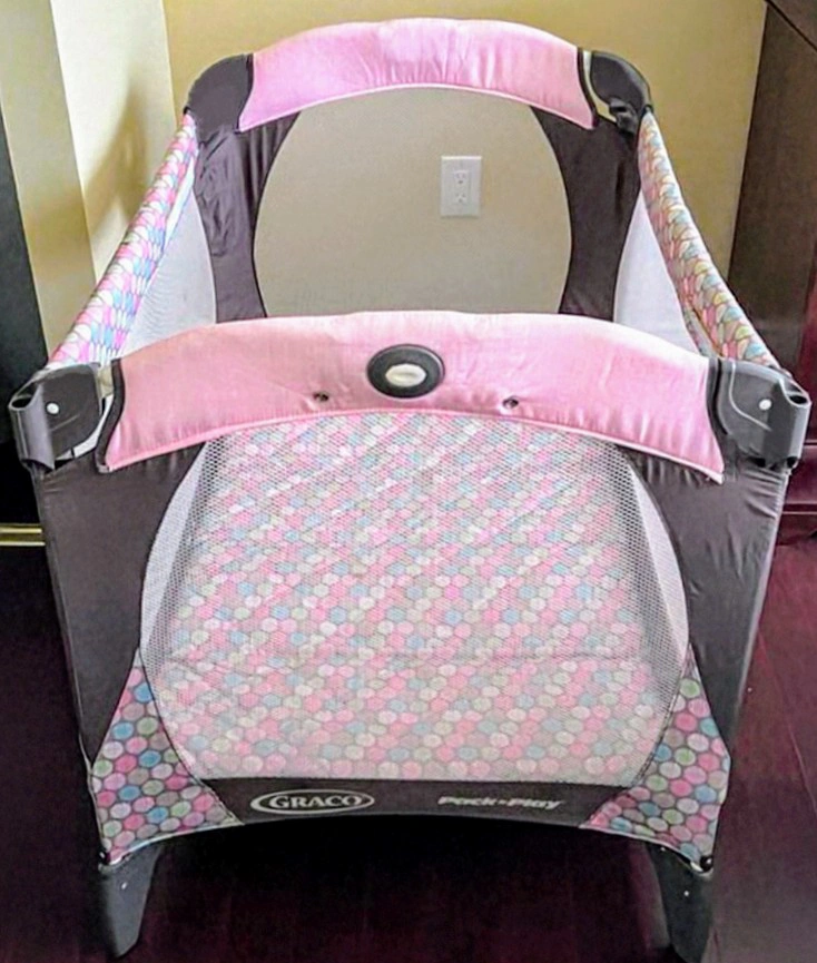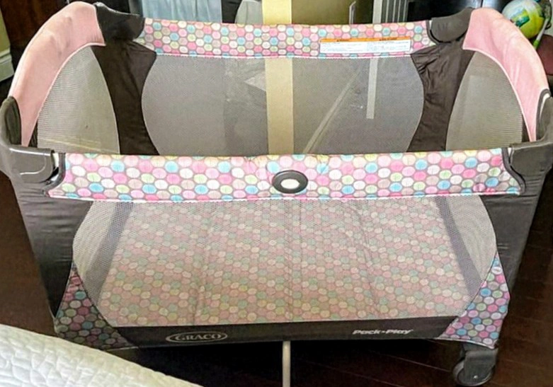 A Graco Pack 'n Play Playard in pink with a multi-coloured geometric design. It comes with a mat. In Excellent Like-new Condition This pack n play is perfect for travel with folding feet and wheels that fold in compactly. Has a durable and sturdy frame that can stand up to lots of on-the-go use. Push-button fold allows you to fold it down quickly and without hassle, and fits easily into small spaces for no-fuss travel or storage. Whether at home or away, your baby will be kept comfy and cozy for sleep or play! *Barely used travel pack n play-was only used a few times when visiting with grandparents *Like-new* Kerr and Speers area Oakville *Serious Buyers Only Please-*Message if Interested for purchase. Thank you!