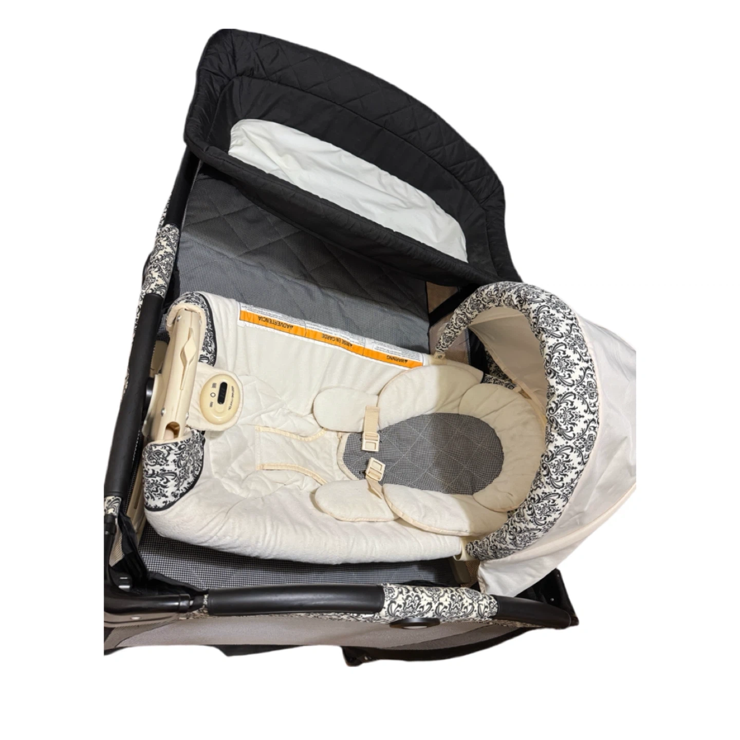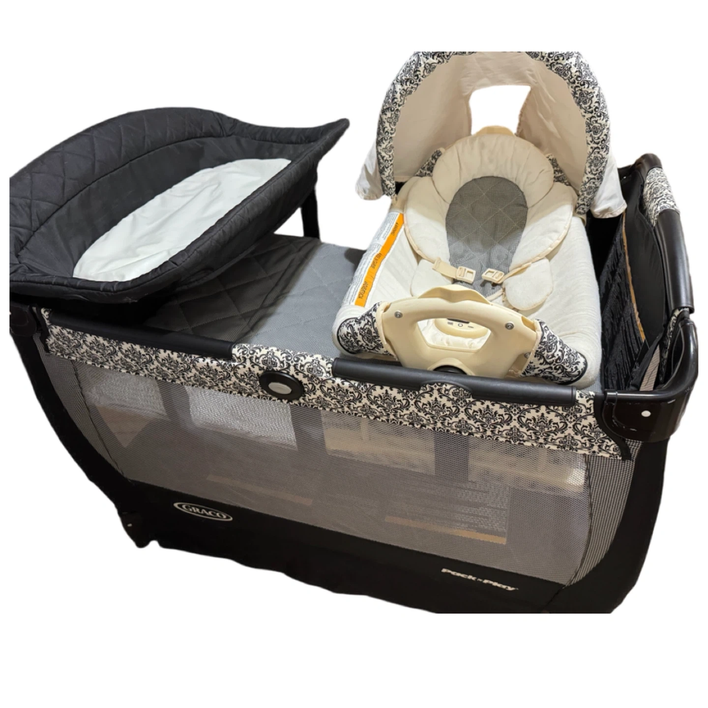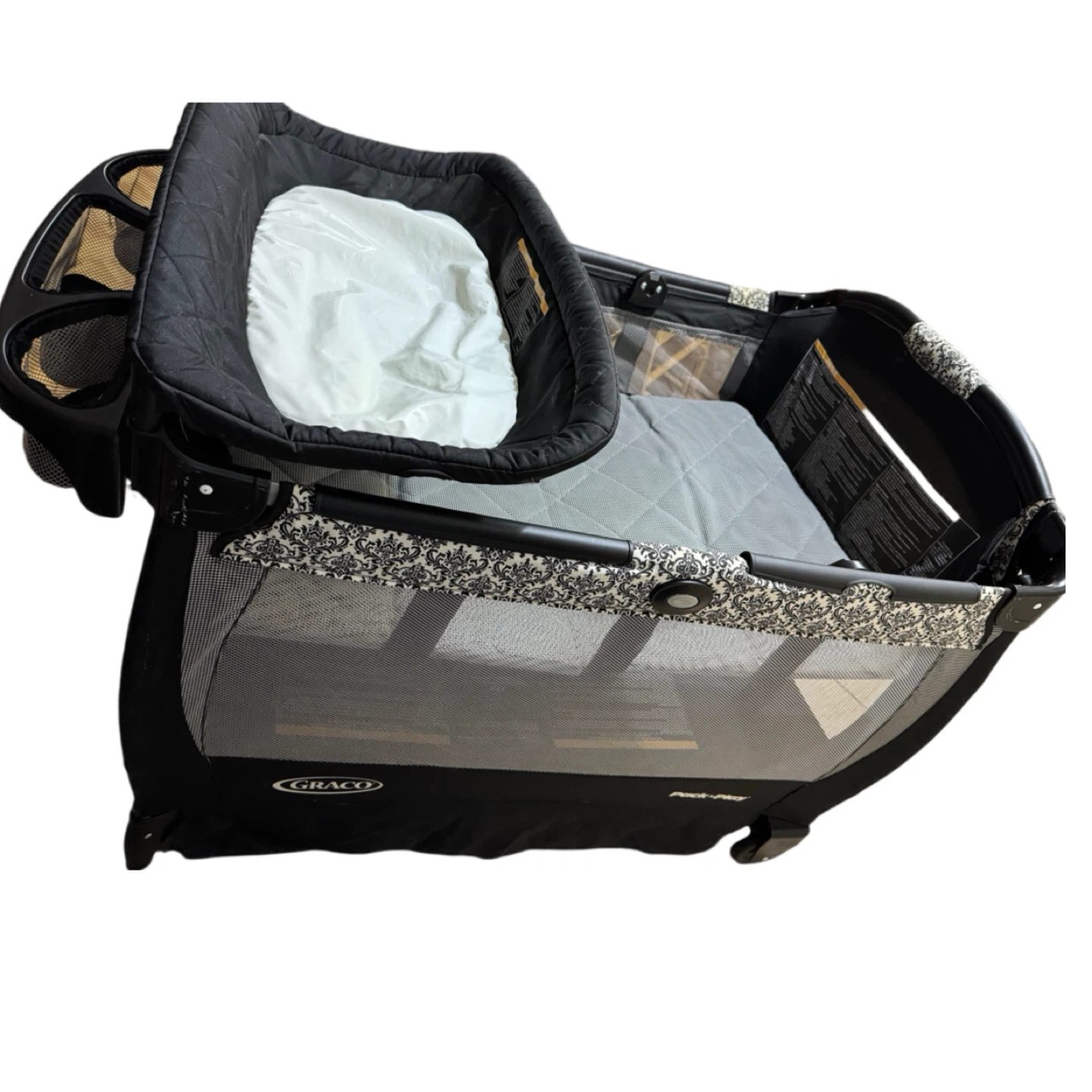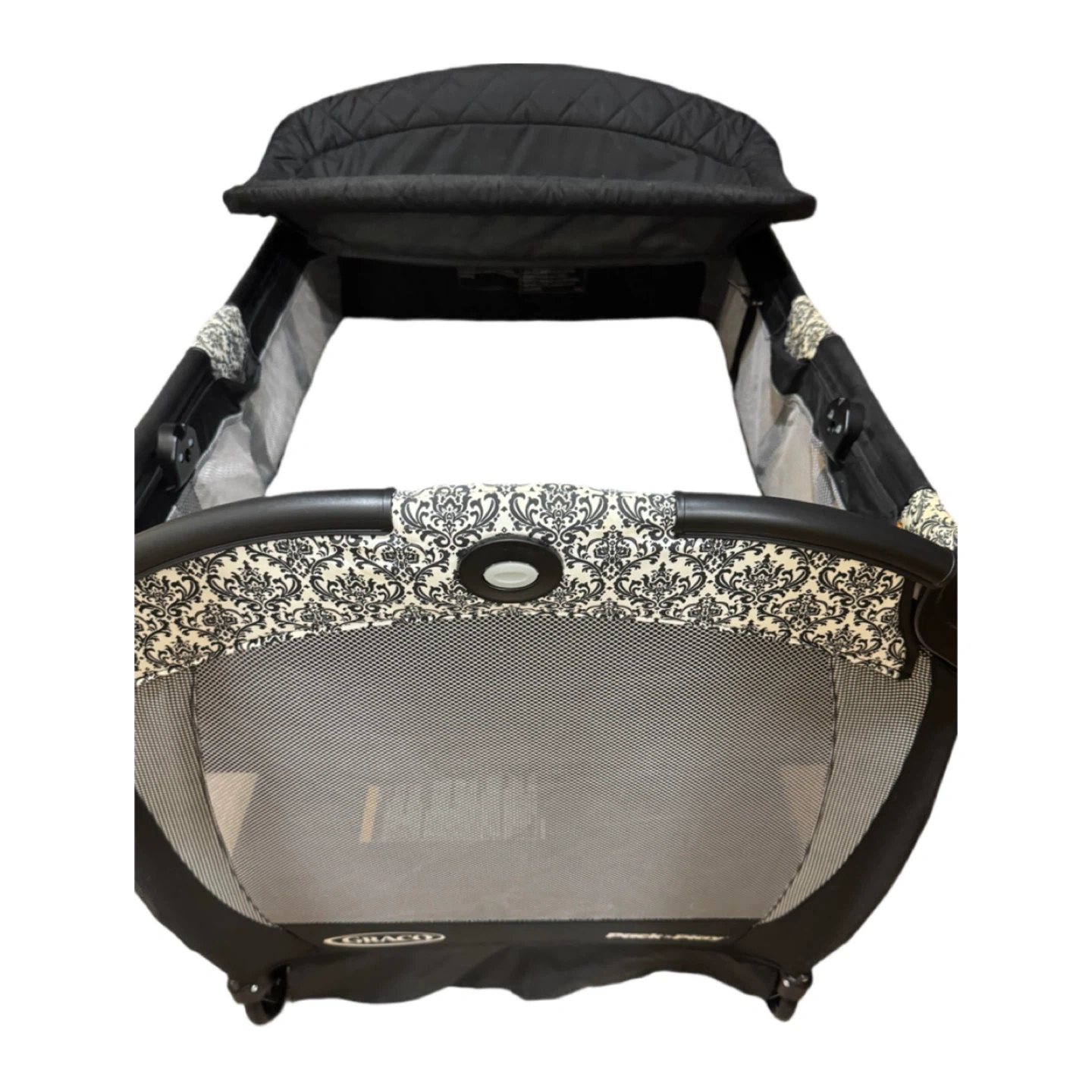 Selling a gently used Graco Pack 'n Play playard! It's in great shape and has a stylish black and white pattern. Perfect for newborns to toddlers. Been stored in a basement and needed a cleaning. Still in good condition.