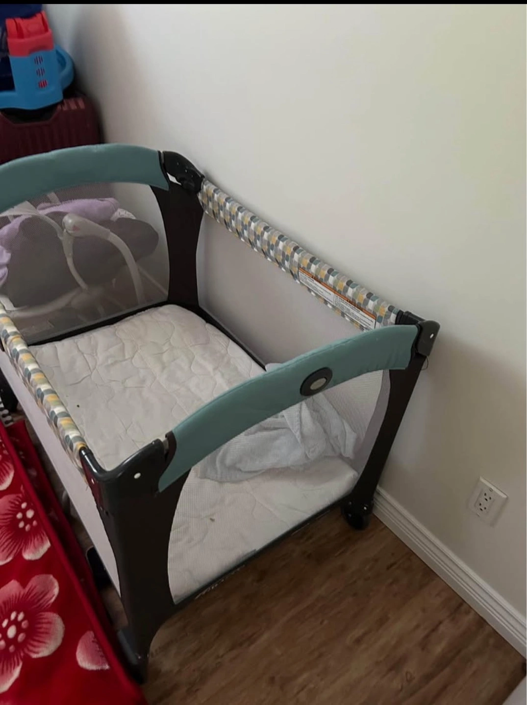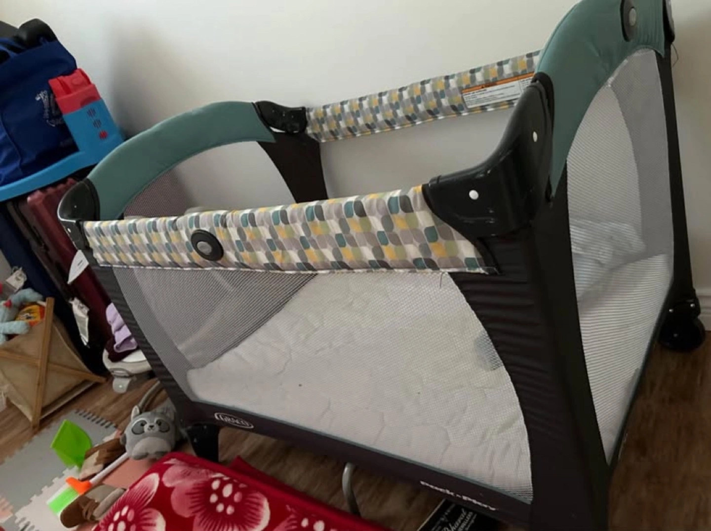 Portable playard, easy to fold and store. Includes mattress. Teal and grey colour scheme. Great for travel or home use.