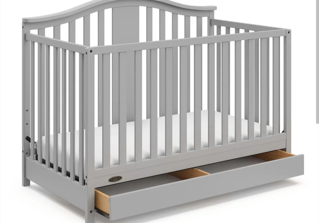 Selling a gently used Graco baby crib in a neutral grey colour. It features a convenient storage drawer underneath, perfect for keeping baby essentials close at hand. It's in great condition and ready for a new home!