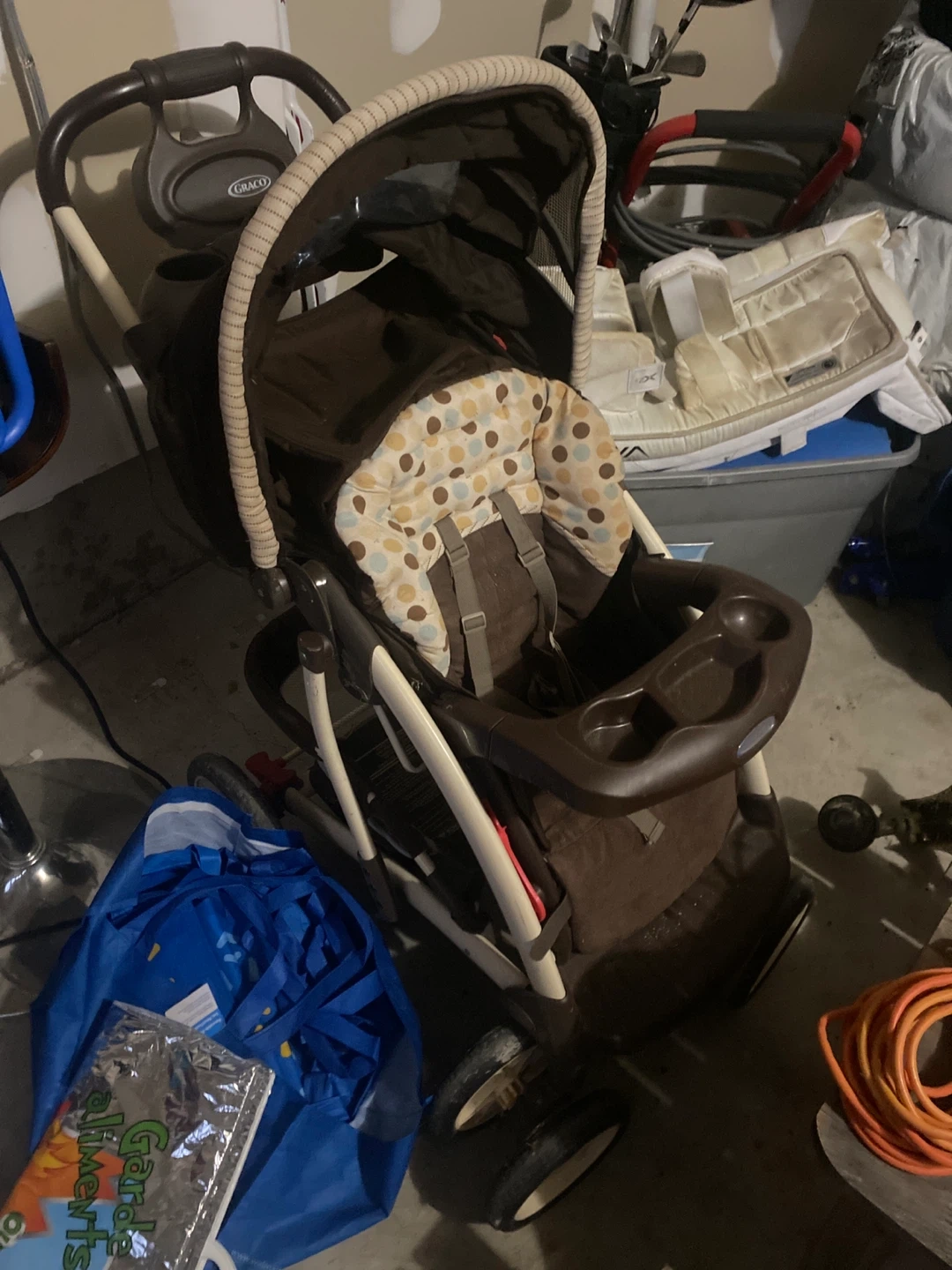 Selling a Graco stroller in brown! It's got a cute polka dot pattern on the seat. Perfect for taking your little one out for a stroll