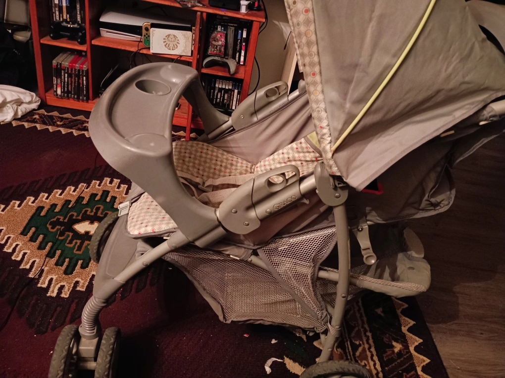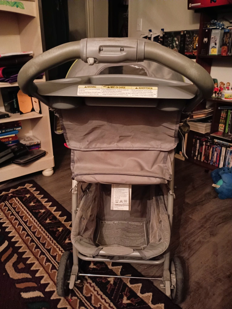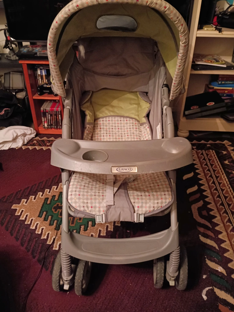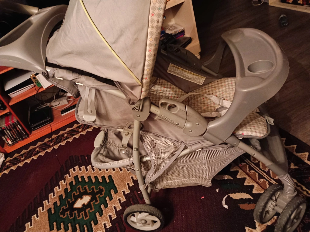 Used Graco stroller with Grey and green colour scheme. Features a canopy, tray, and storage basket. Suitable for infants and toddlers.