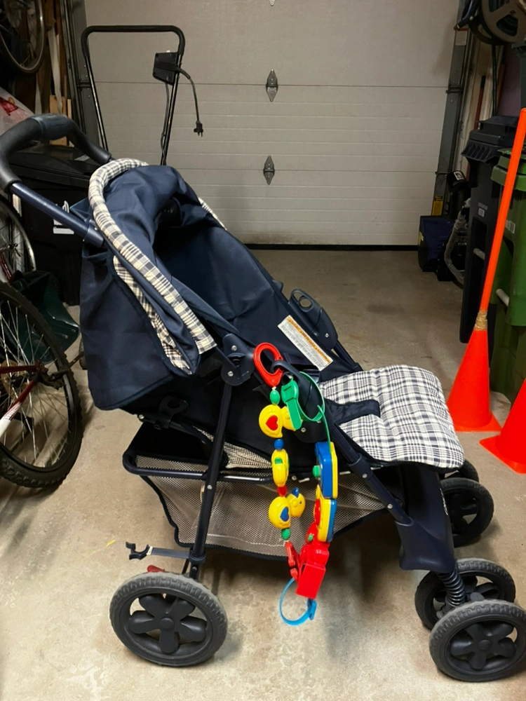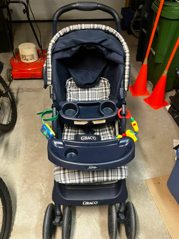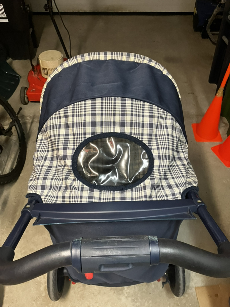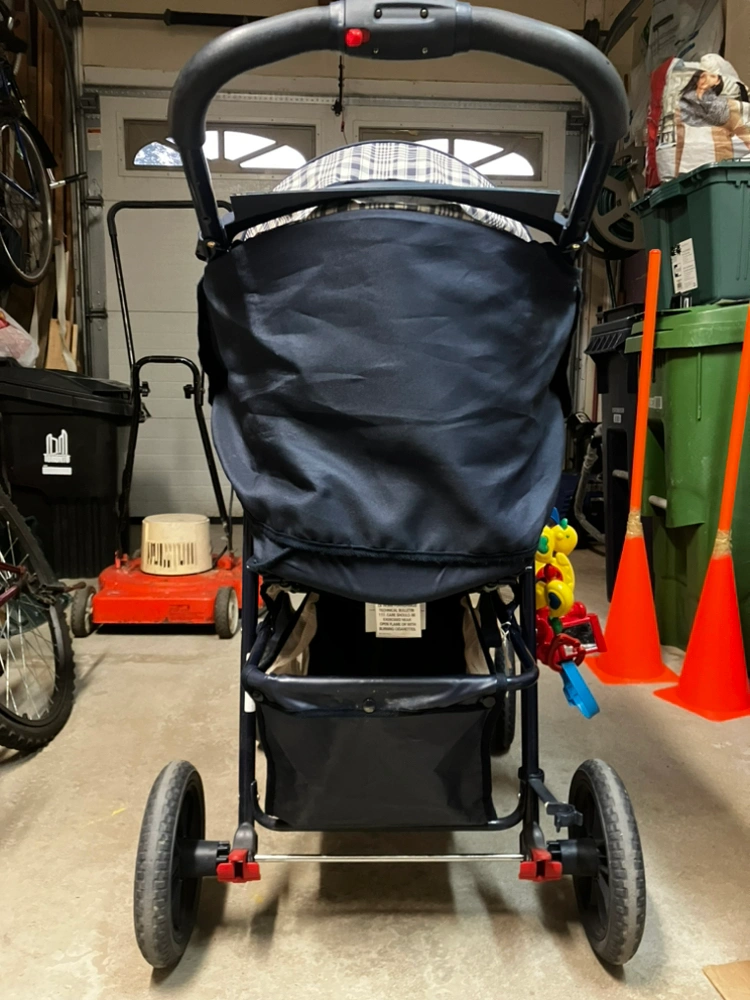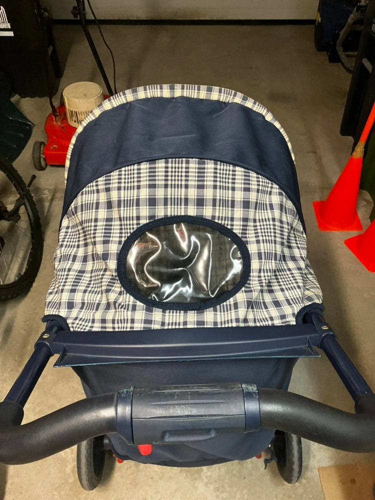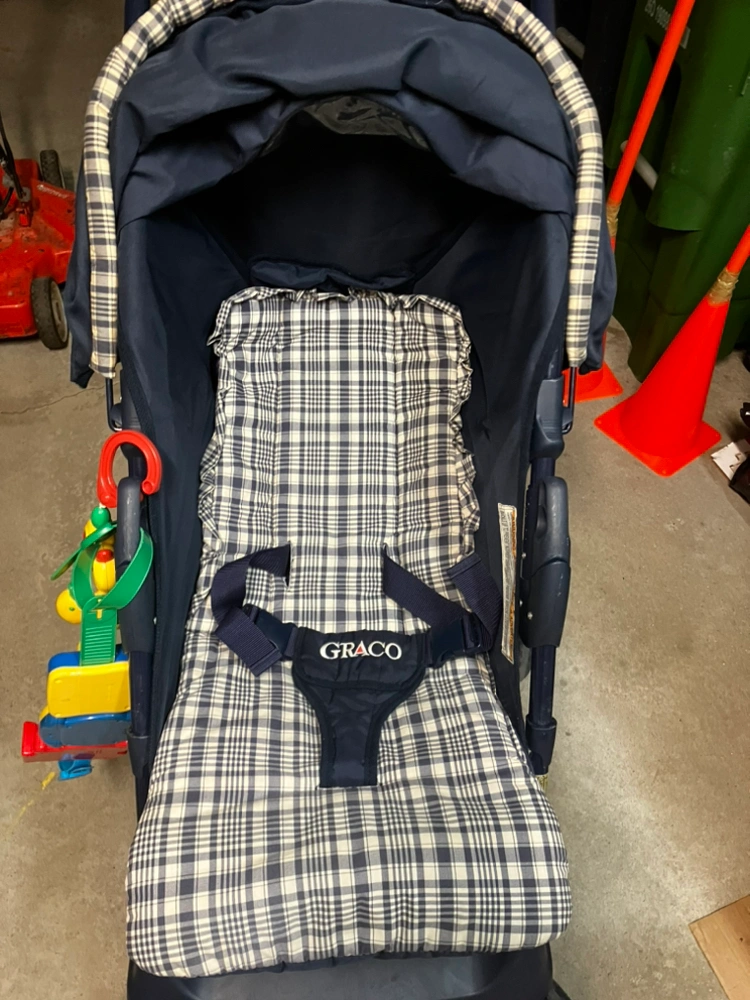 Navy blue plaid stroller in good condition Comes with rain cover Sturdy and durable