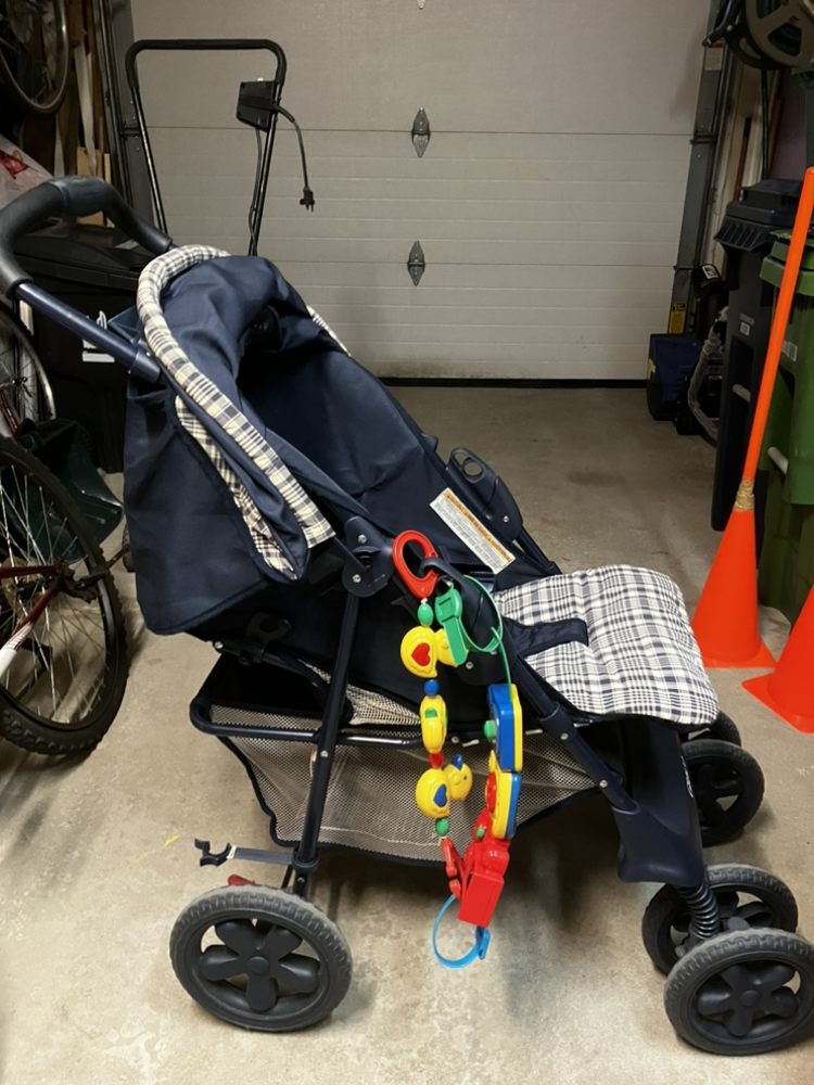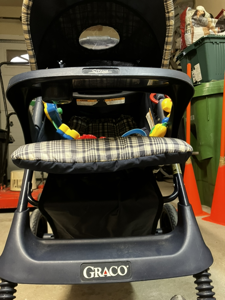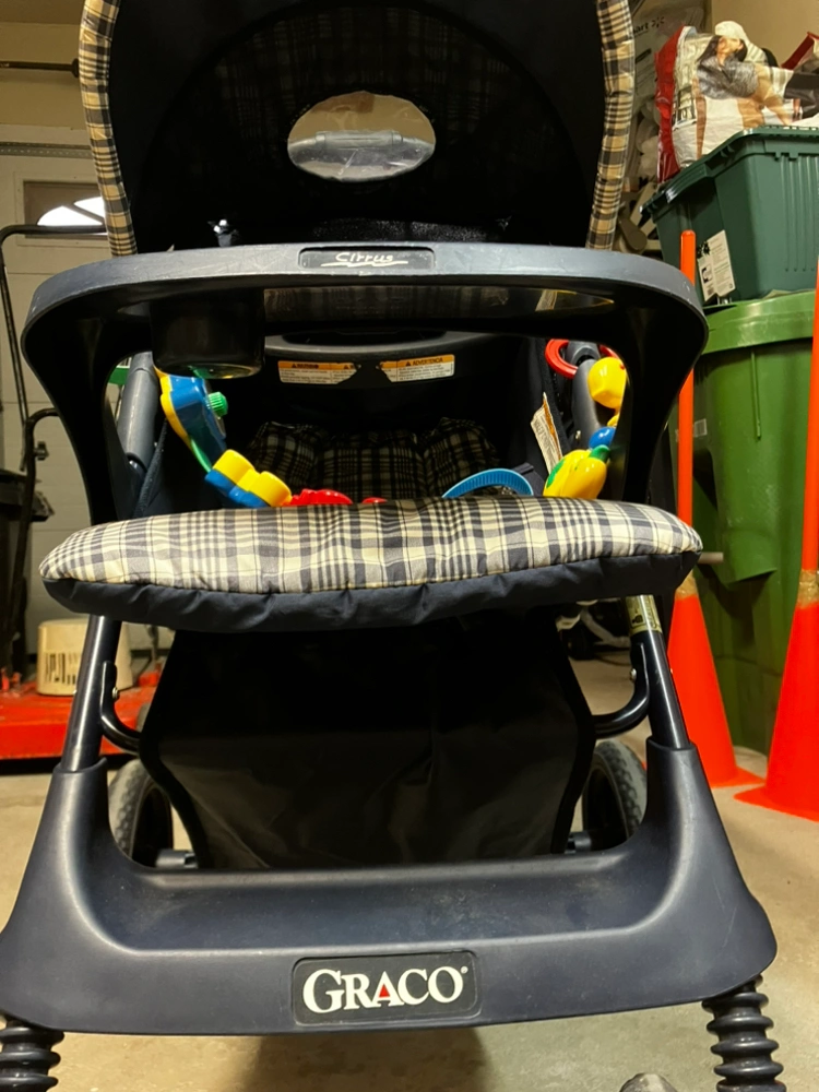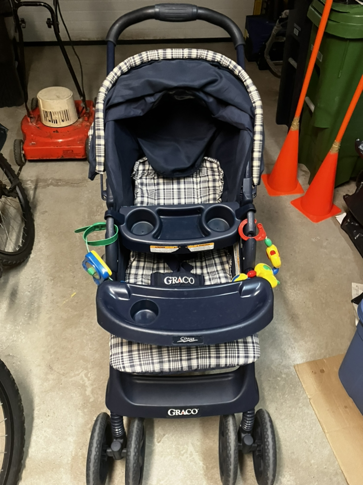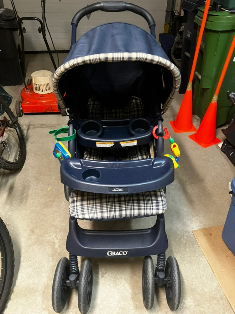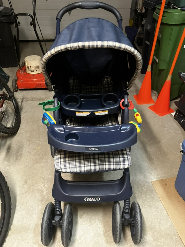 Navy blue plaid stroller in good condition Comes with rain cover Sturdy and durable