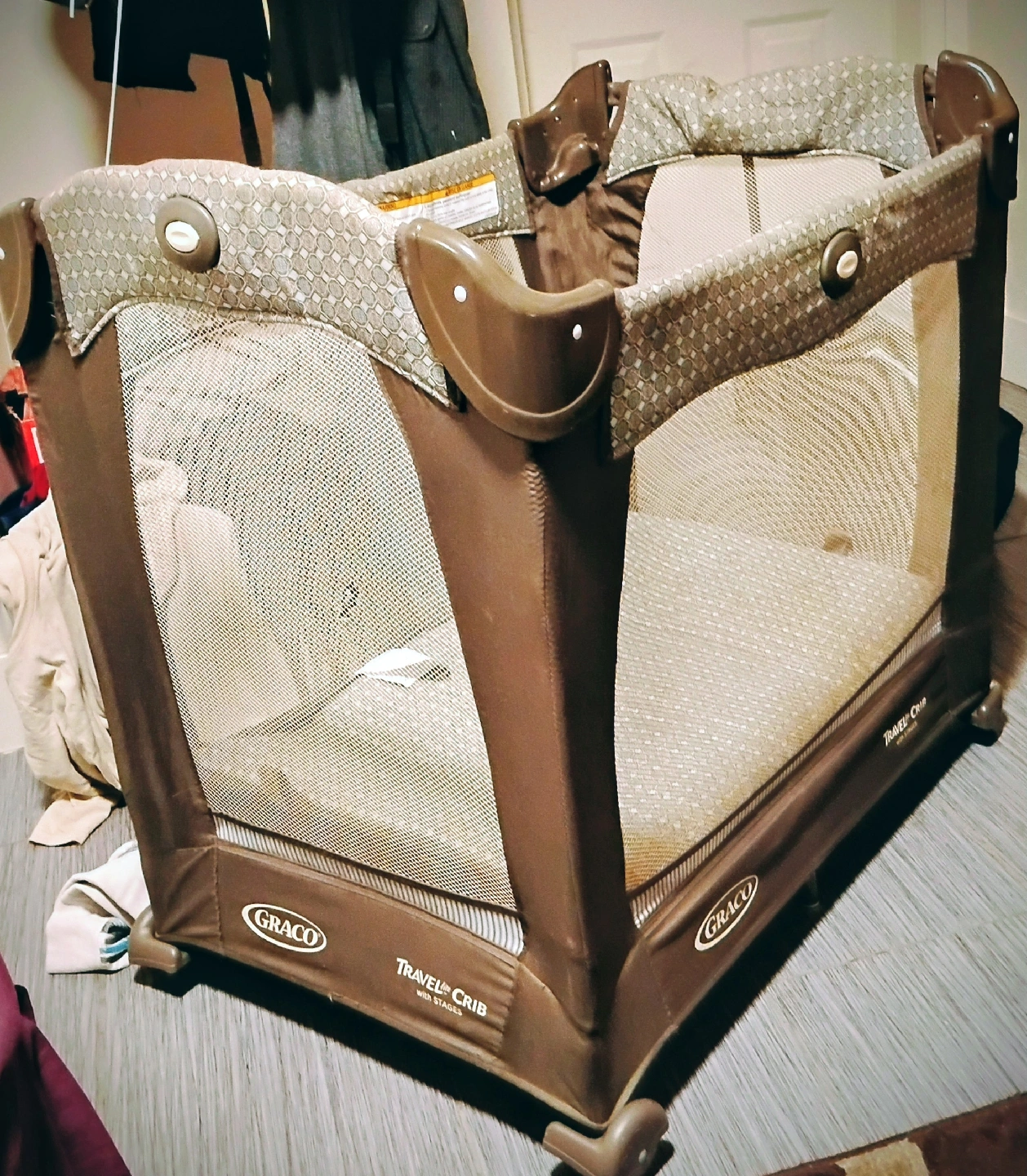 Selling a Graco Travel Crib with Stages. It's in good condition and perfect for travel or small spaces. It's brown and beige with a mesh lining for good airflow. Great for babies and toddlers!