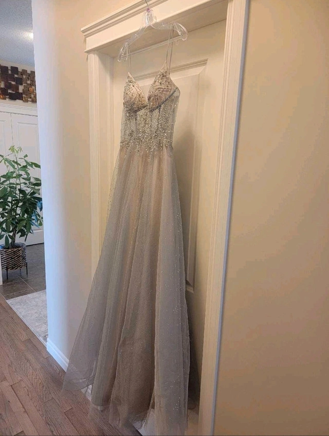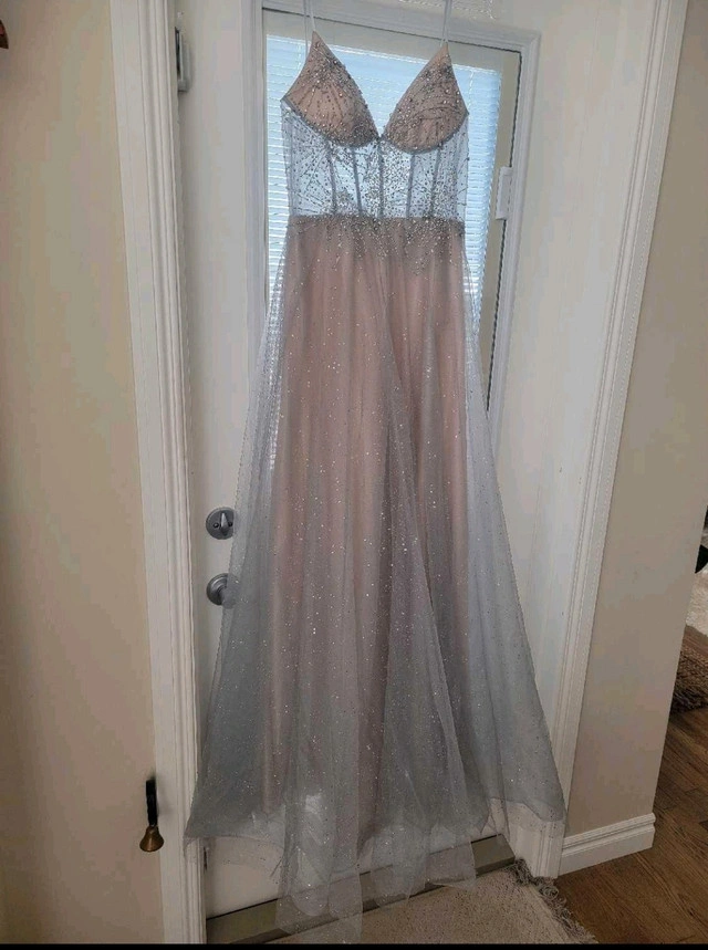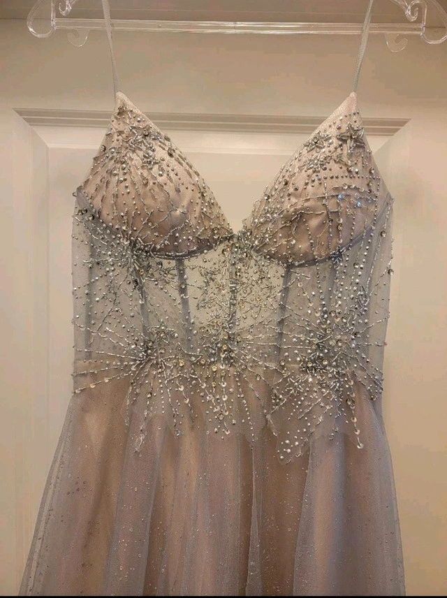 Sheer silver corset-style dress with embroidery, over gold underlay. Made by Terani Couture and purchased in Edmonton. No alterations have been done so this dress is in its original state. Purchased for $629.