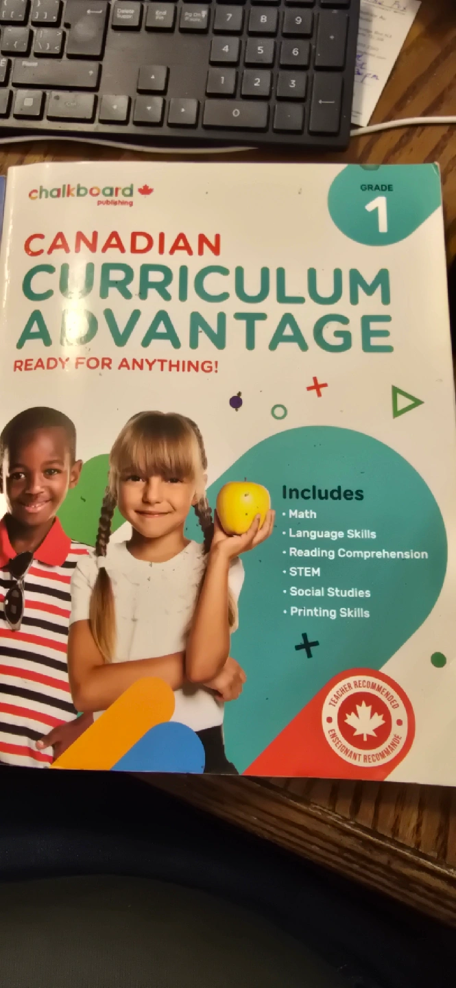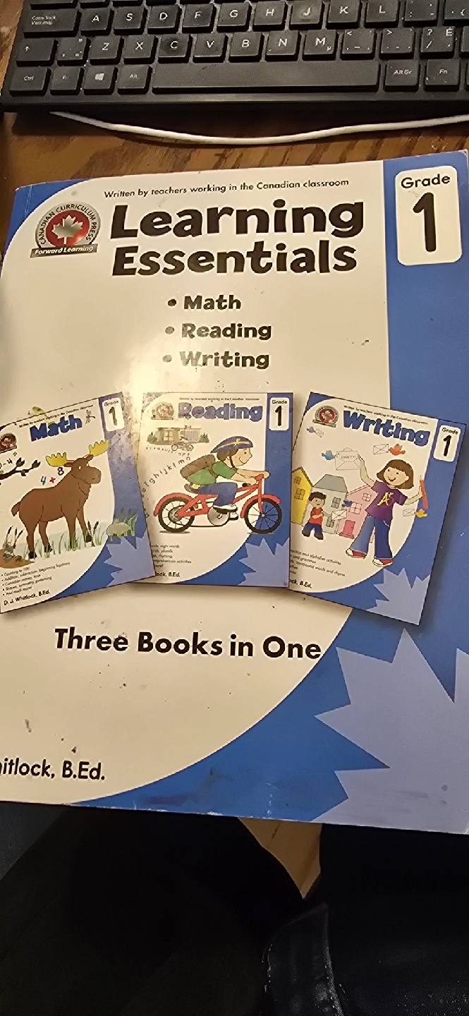 Selling two Grade 1 workbooks: Learning Essentials (Math, Reading, Writing) and Canadian Curriculum Advantage (Math, Language Skills, Reading Comprehension, STEM, Social Studies, Printing Skills) price is for both books together