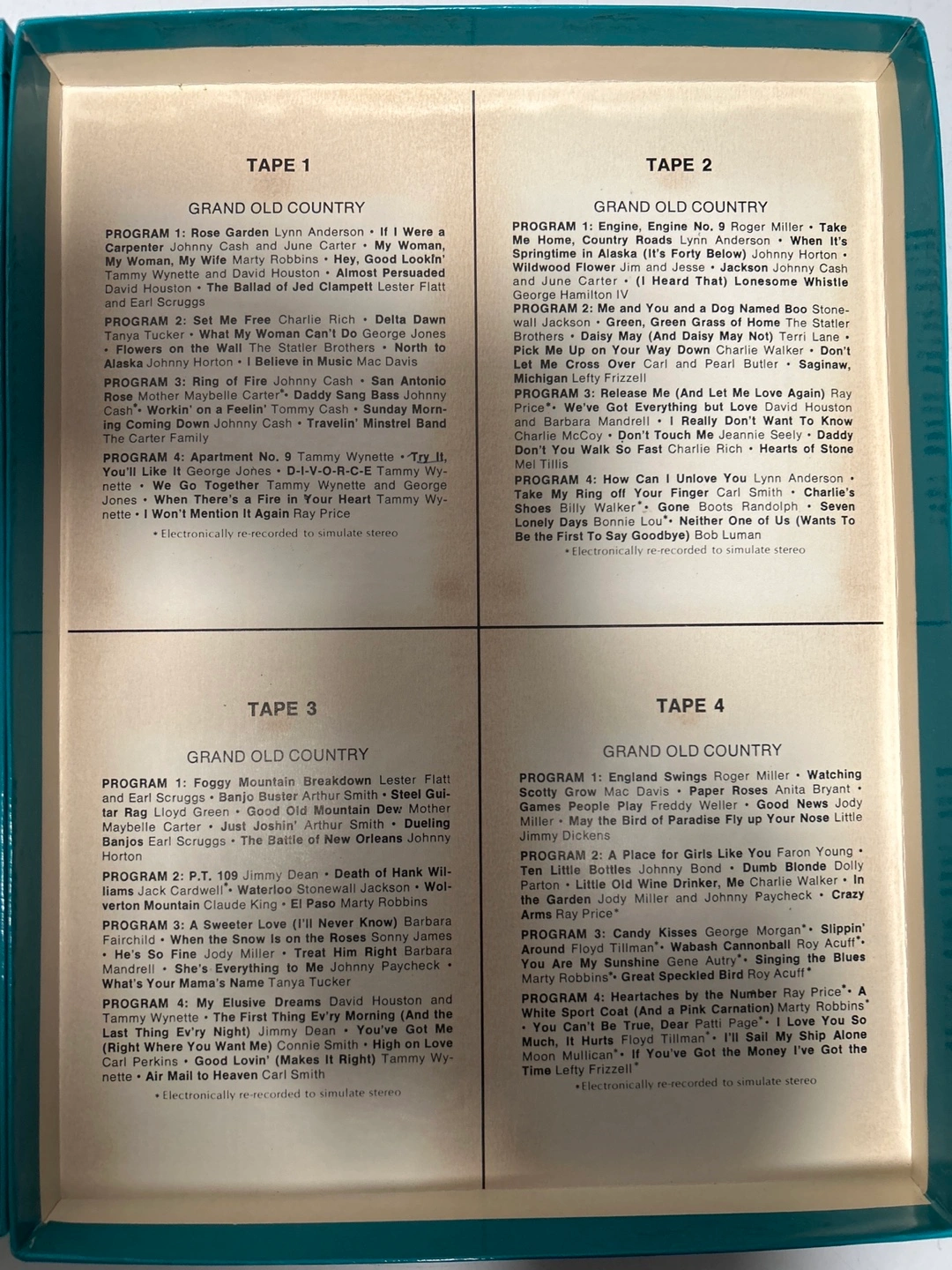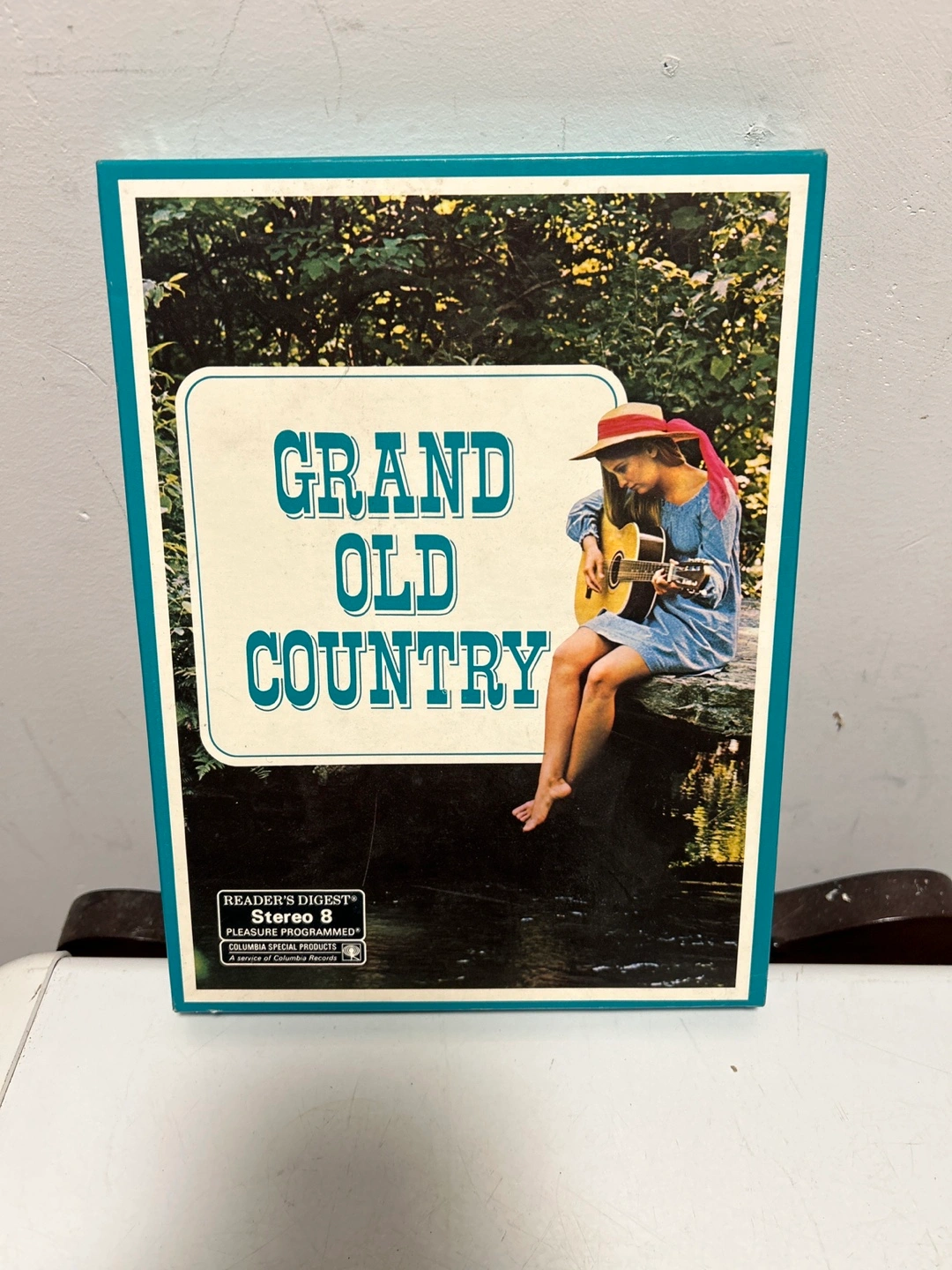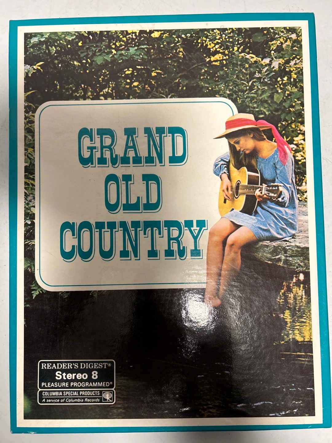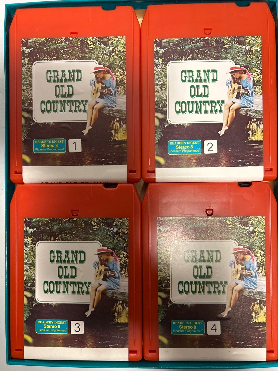 Selling a set of Grand Old Country Reader's Digest Stereo 8 tapes. The set includes four tapes in a box. Each tape features a collection of classic country songs.