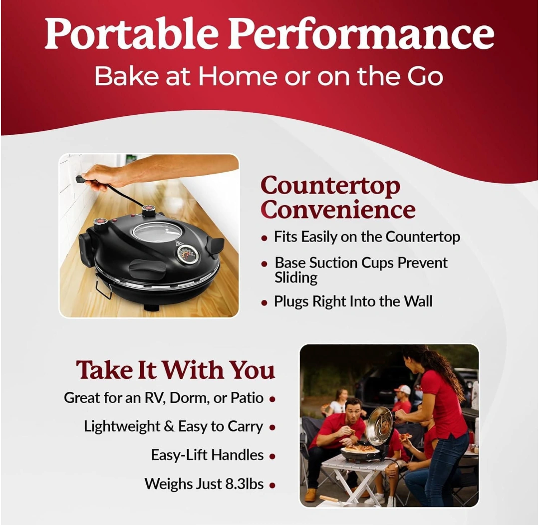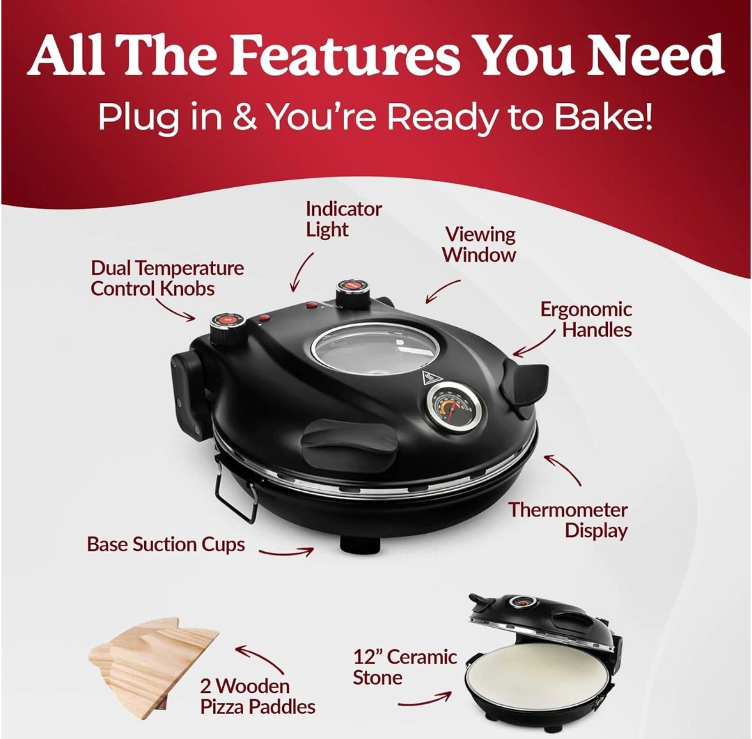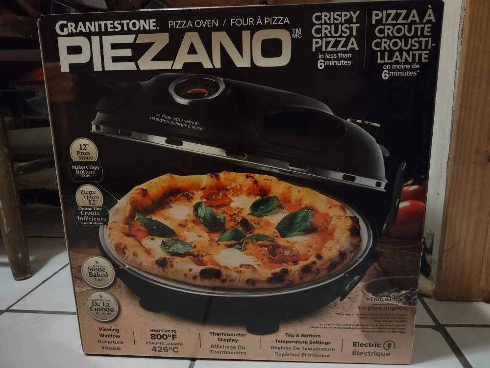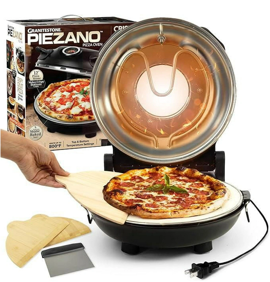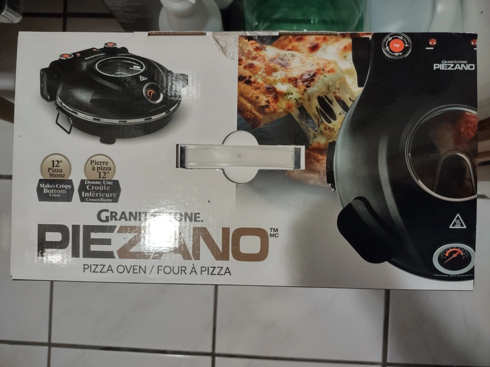Get crispy crust pizza in less than 6 minutes with this Granitestone Piezano pizza oven! It heats up to 800°F (426°C) and features top & bottom temperature settings. The oven includes a 12" ceramic stone and 2 wooden pizza paddles. It also has a viewing window and a thermometer display so you can keep an eye on your pizza. Brand new never used.