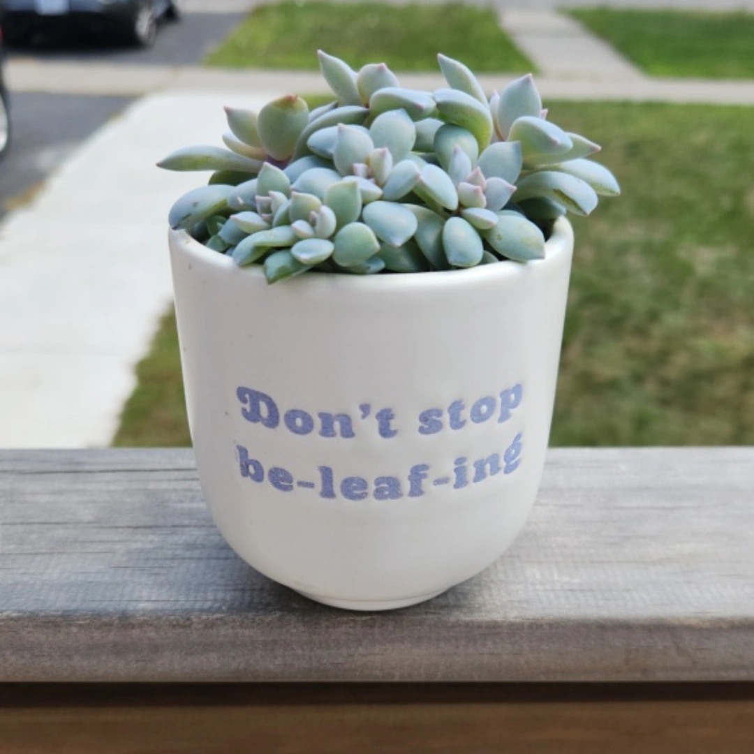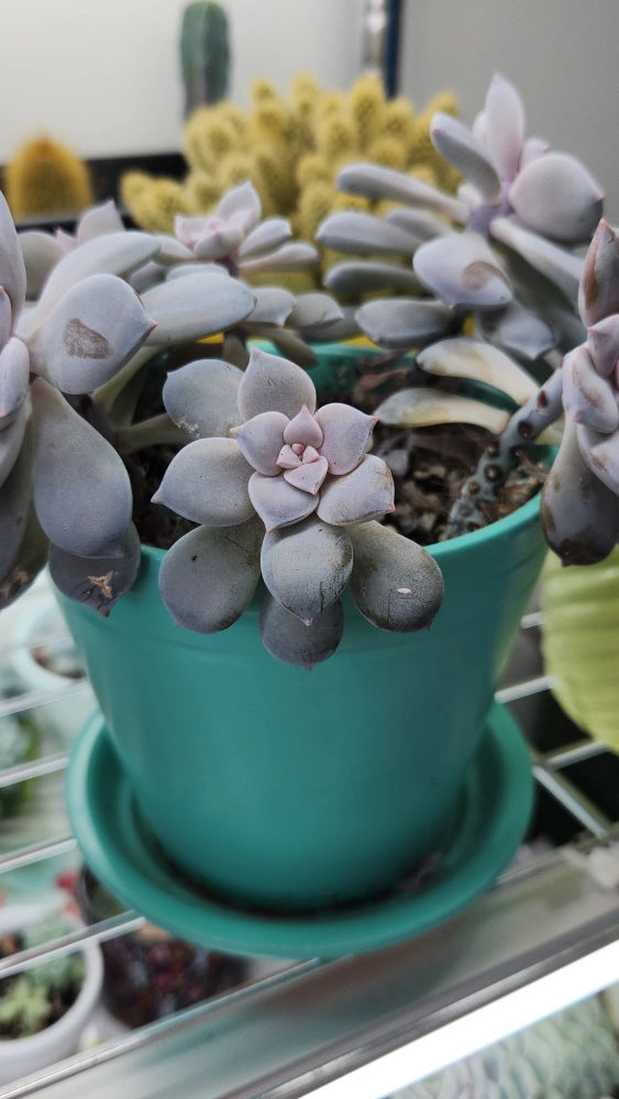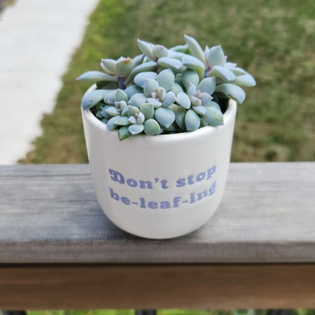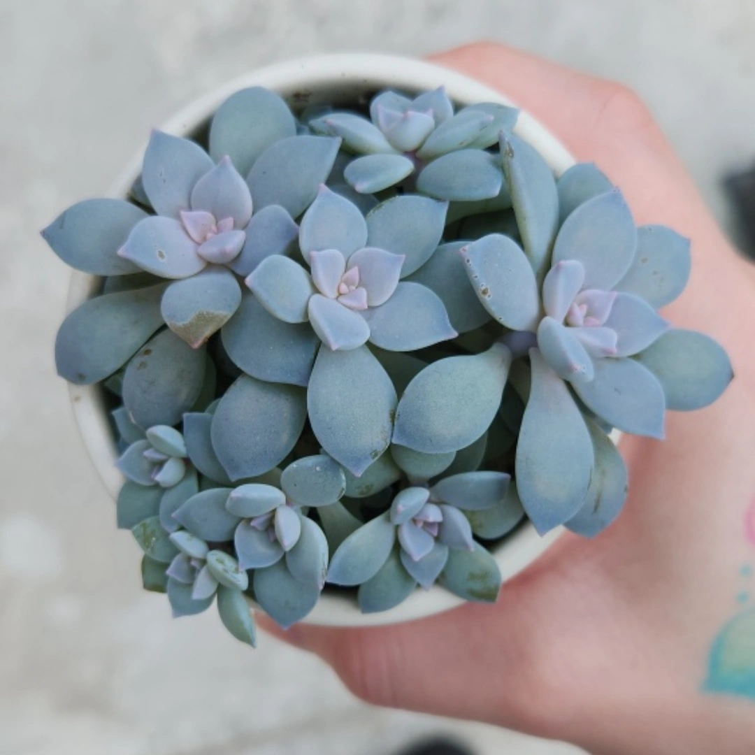 A cute little pot (with drainage) full of established graptopetalum superbum purple succulent plants. I didn't attempt to count them all but there's at least 8 seperate plants in there. These plants have a more distinguished purple color than my camera would pick up, however these ones still do lean a bit more blue green but the purple colour is coming in after moving them around on my plant shelf (as you can see in the centre of the plants) . The last photo is of the parent plant (which is also more purple in person, but camera wouldn't pickup true colours) This succulent plant is not fussy and quite easy to care for and an easy one to propagate. it likes a lot of light. no history of pests or fungus. Comes as is with pot and soil. smoke & pet free home.