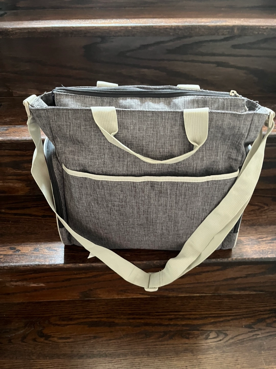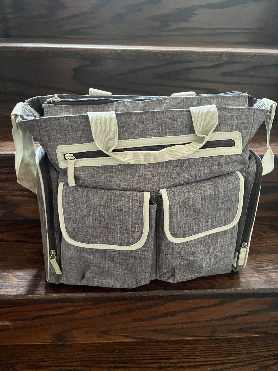 A nice gray diaper bag. Equipped with a couple of external pockets on the front. Also, features a top handle and a shoulder strap. Take this bag with you wherever you need to go.