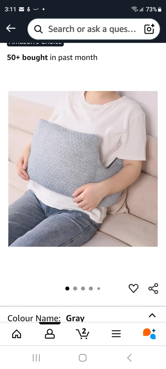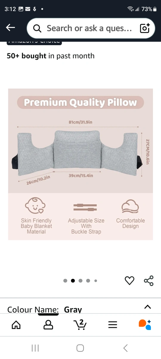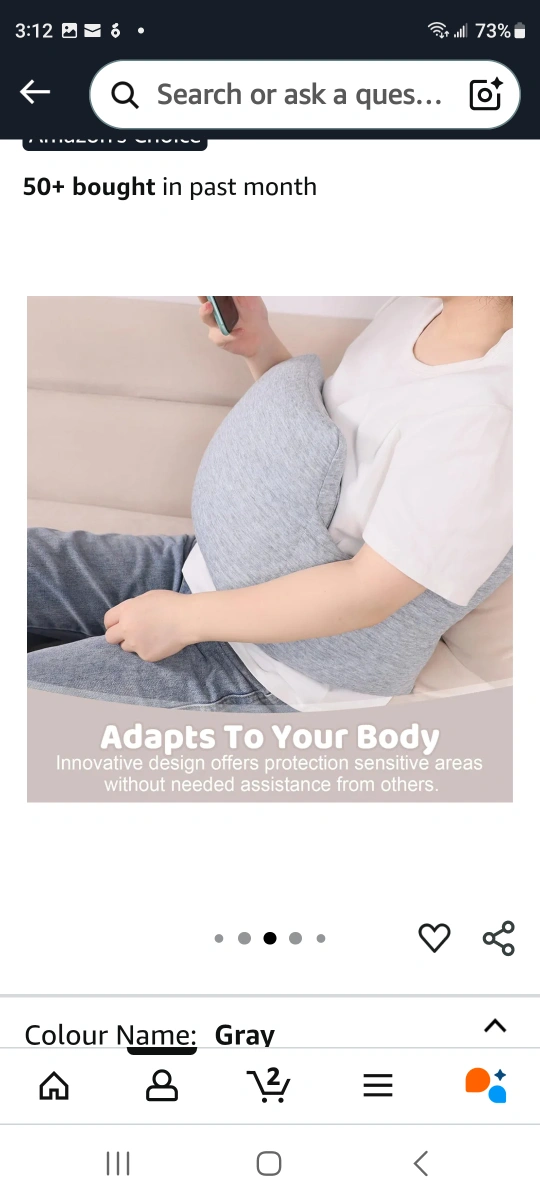 This is a premium quality pillow in gray. It adapts to your body with an innovative design that offers protection to sensitive areas without needing assistance from others. It's made with skin-friendly baby blanket material and has an adjustable size with a buckle strap. It also has a comfortable design. Dimensions are 81cm/31.9in, 27cm/10.6in, and 26cm/10.2in