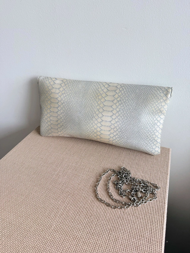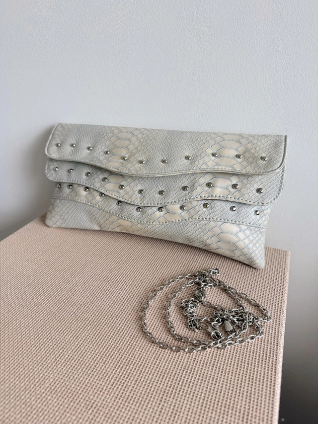 This stylish gray snakeskin clutch is the perfect accessory to elevate your look! It's in good used condition and features unique studded detailing. Comes with a removable silver chain strap for versatile wear. * Snakeskin-like Material * Studded design * Silver chain strap included * Magnetic closure