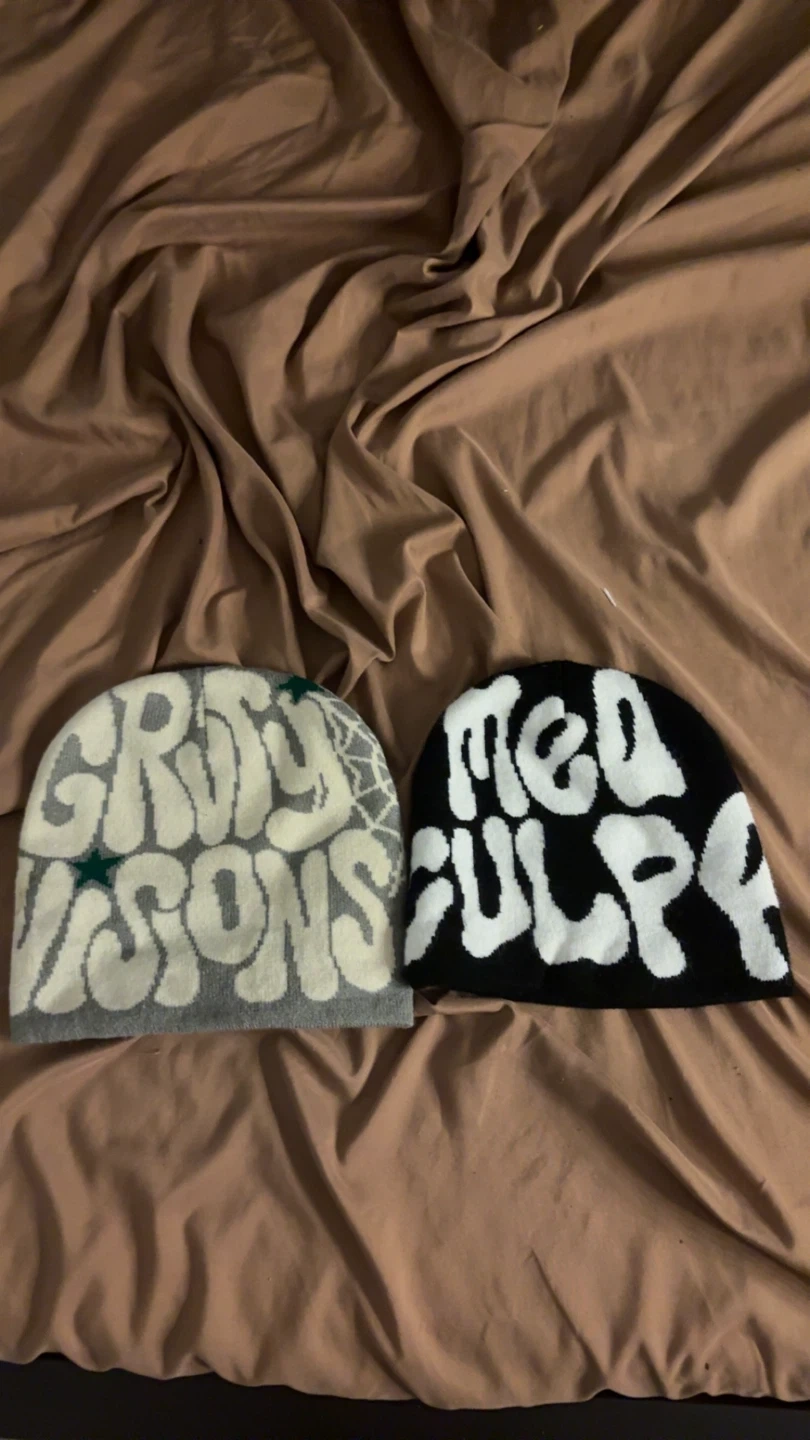Two beanies for sale! One is a gray 'Gray Visions' beanie with green stars and a spiderweb design. The other is a black 'Mea Culpa' beanie with white lettering. Both are in good condition and ready for a new home