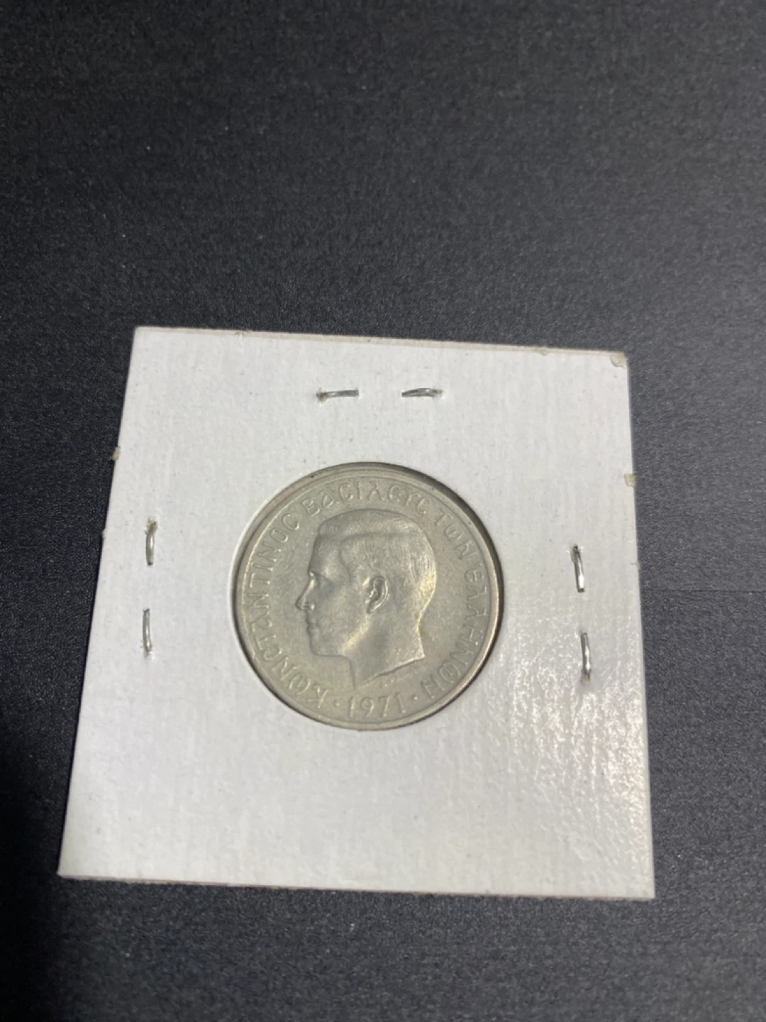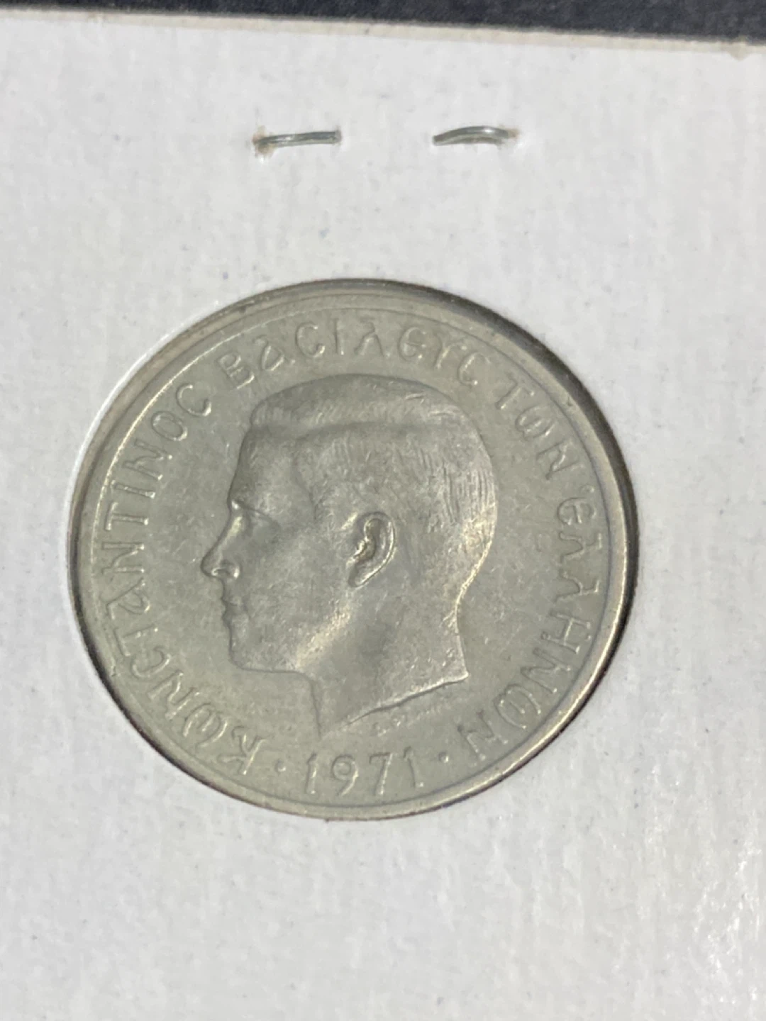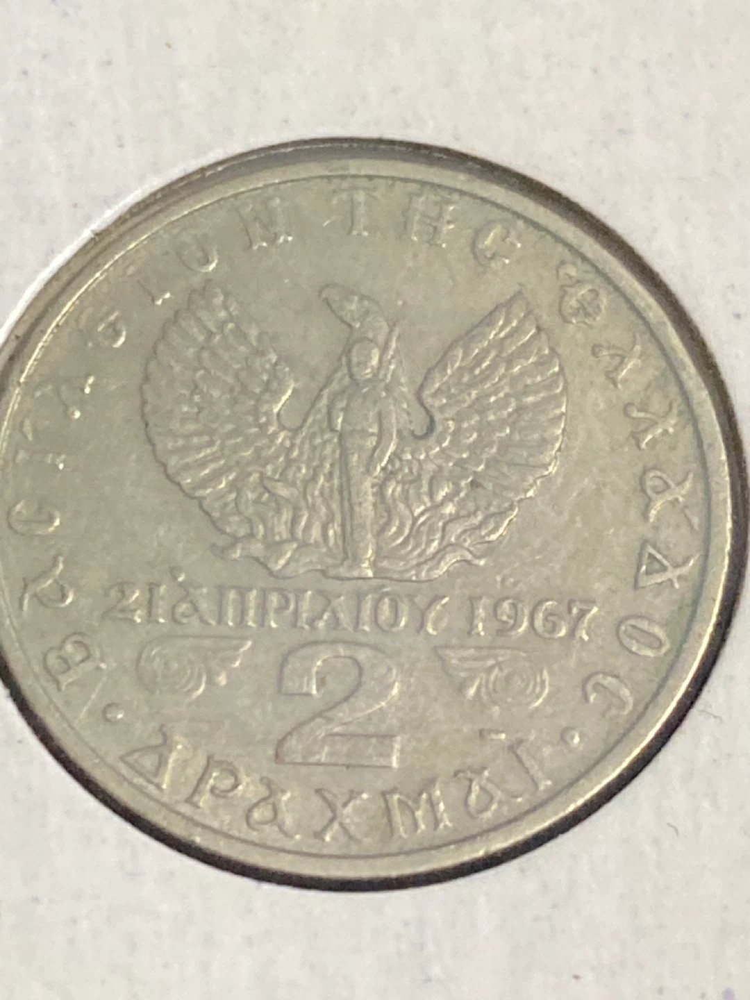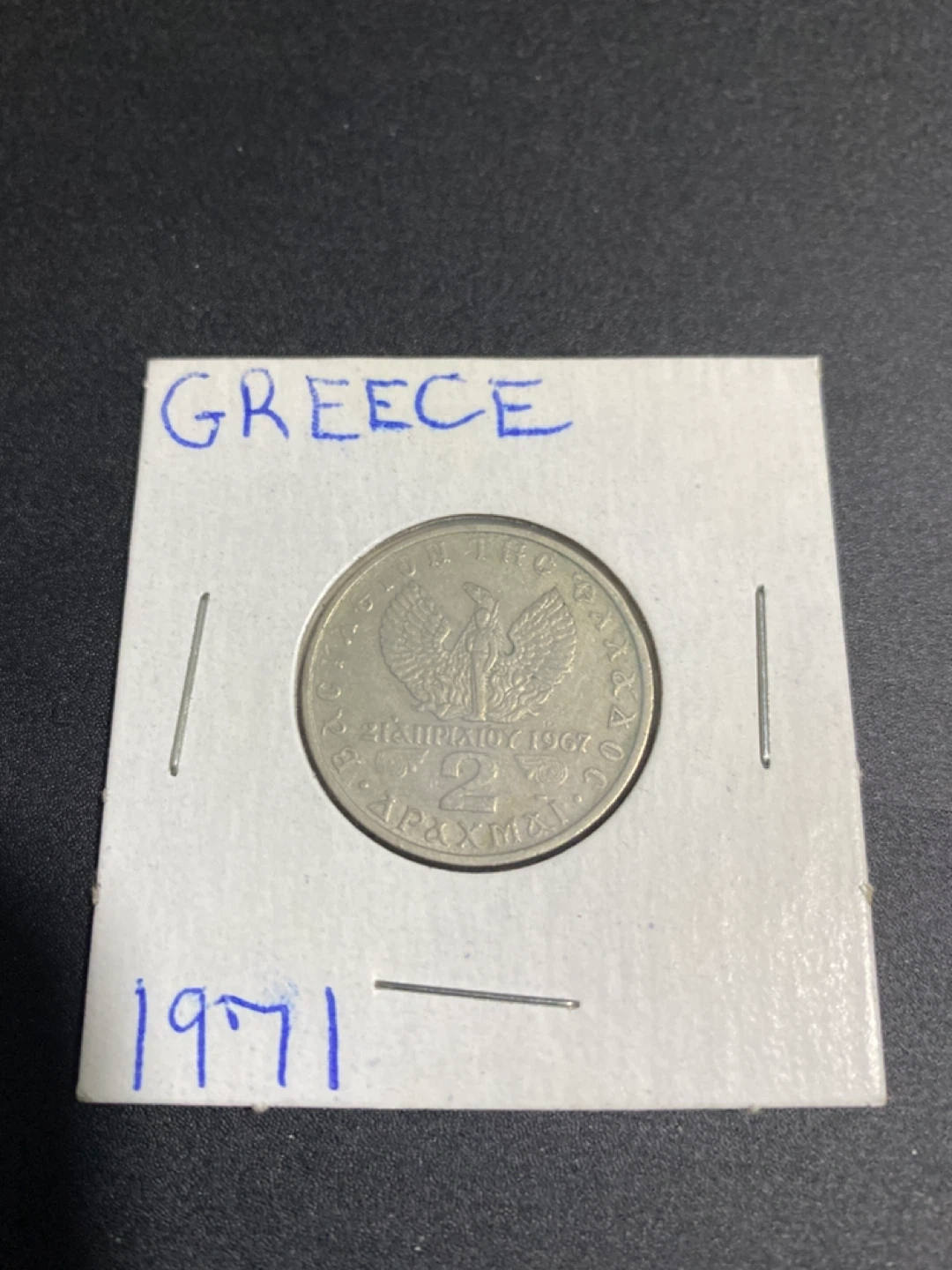 Selling two Greek Drachmai coins. One is dated 1967 and the other is dated 1971. Both coins feature distinct designs and are in good condition for their age