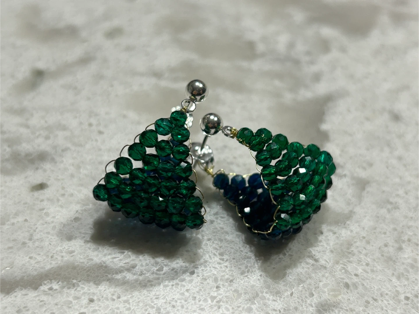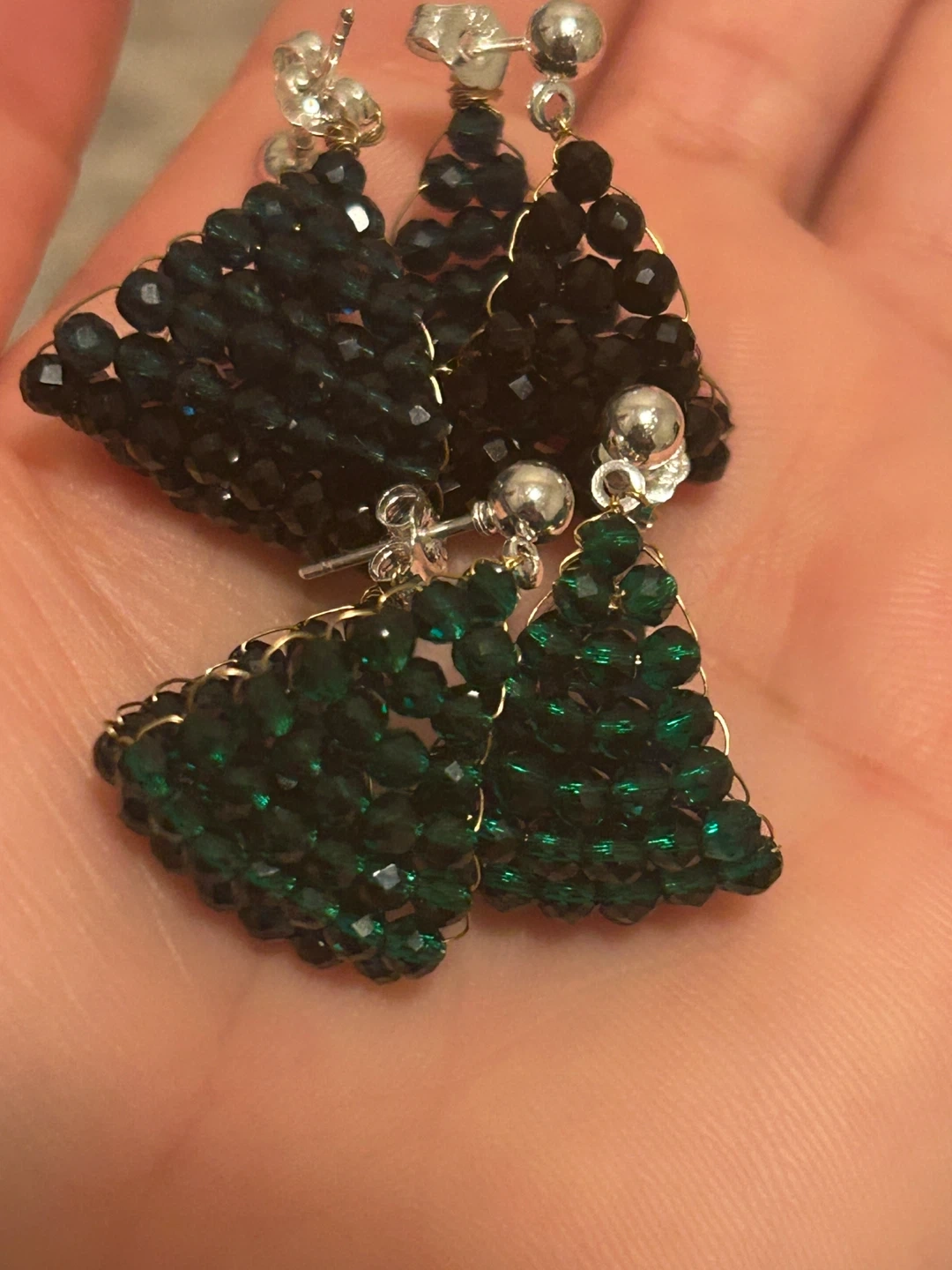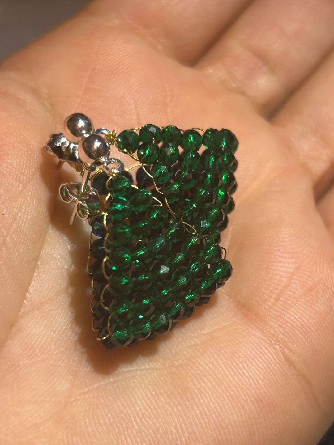 Selling a pair of beaded triangle earrings. They are green and have a silver stud. They are in great condition!