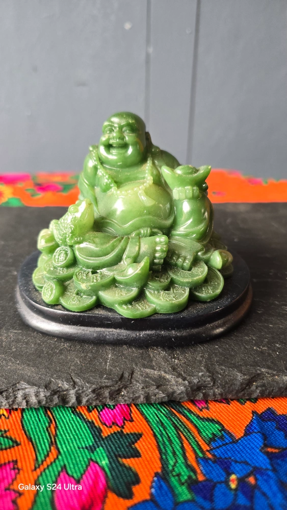 Here's a charming green Buddha statue figurine. It's a lovely decorative piece that would look great in any room. Perfect for adding a touch of zen to your space!