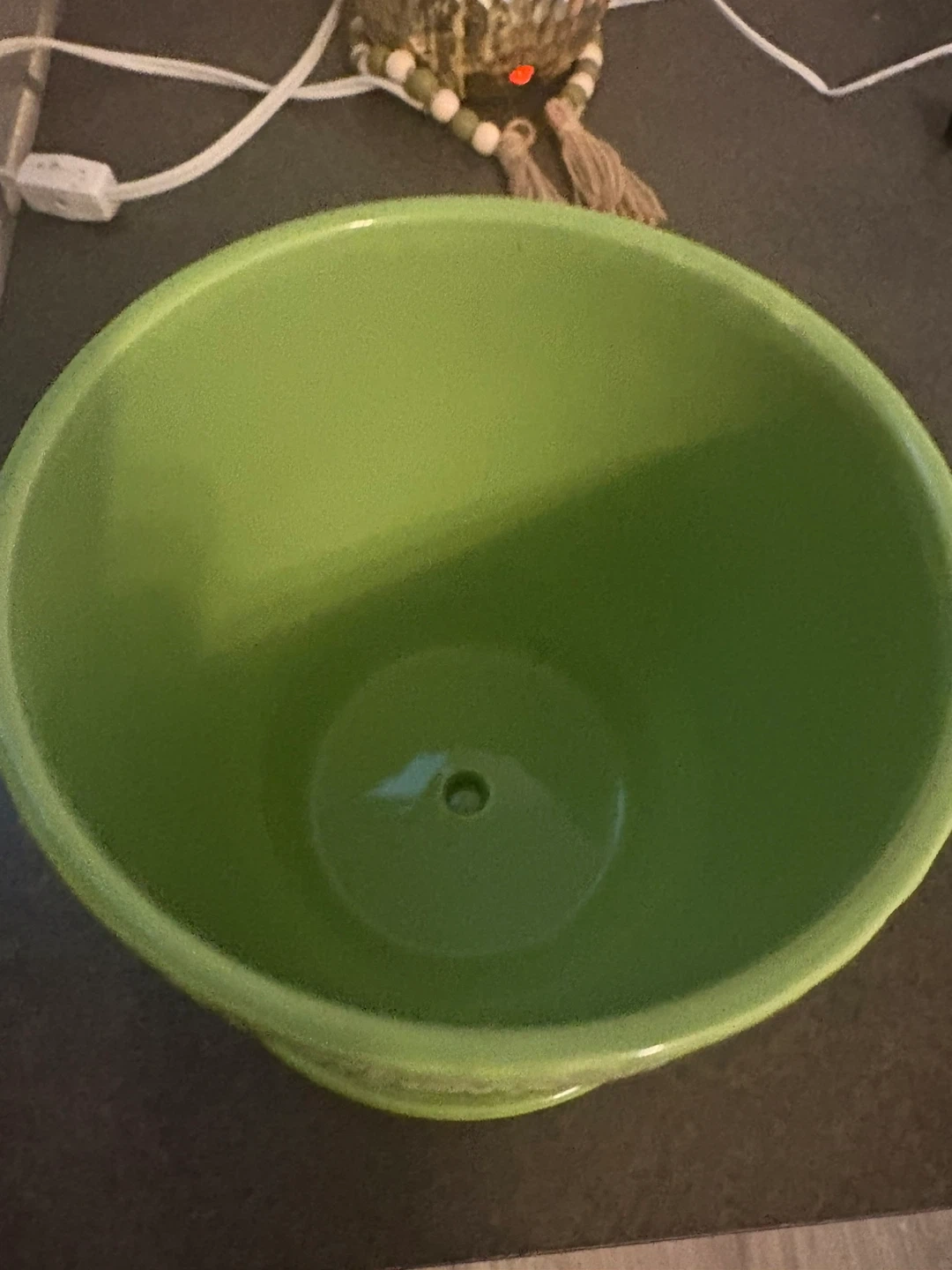 A lovely green ceramic planter, perfect for adding a pop of colour to your indoor garden! It comes with a matching saucer to help prevent water damage to your surfaces. It's in great condition and ready for a new home!